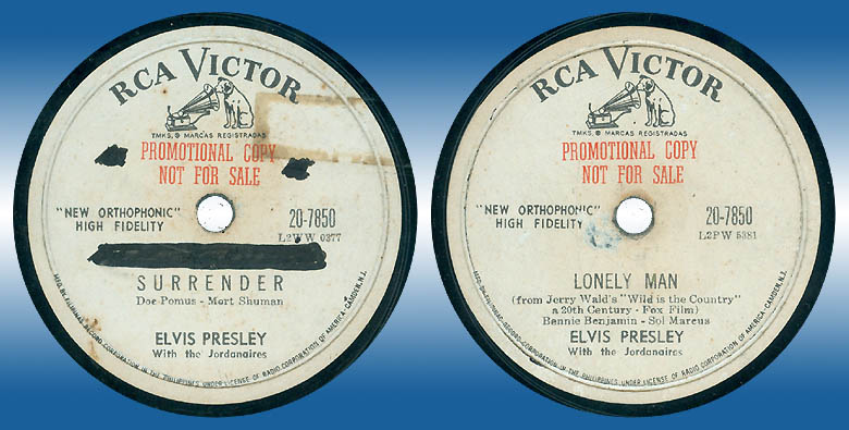RARE PROMOTIONAL RECORD. Philippines Pressed ELVIS PRESLEY with the JORDANAIRES. Manufactured in the Philippines by Filipinas Record Corp. under RCA VICTOR Records. NEW ORTHOPHONIC, HIGH FIDELITY. PROMOTIONAL COPY. With Catalogue No. 20-7850.