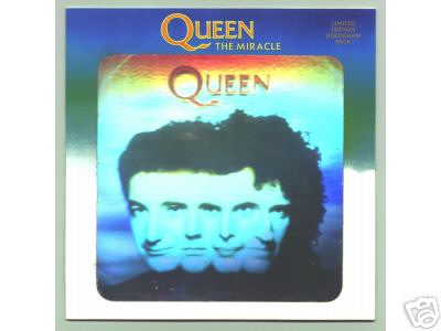UNRELEASED PICTURE SLEEVE FOR QUEEN,S THE MIRACLE FROM 1989.THIS IS VERY DIFFERENT FROM THE ONE THAT WAS RELEASED WITH THE YELLOW AROUND THE HOLOGRAM.THE 12 INCH CAME WITH A BLUE AND A YELLOW SLEEVE,BUT THE 7 INCH SINGLE HAD A NORMAL SLEEVE AND HOLOGRAM SLEEVE.