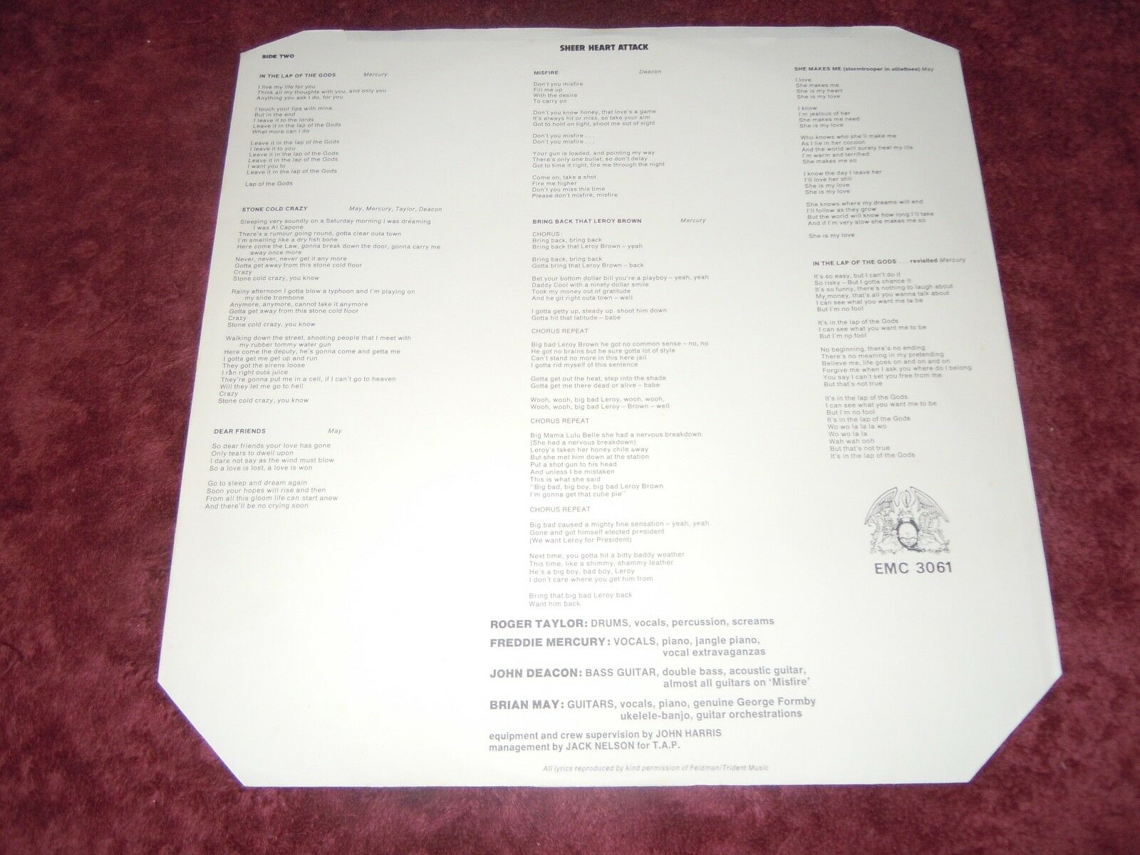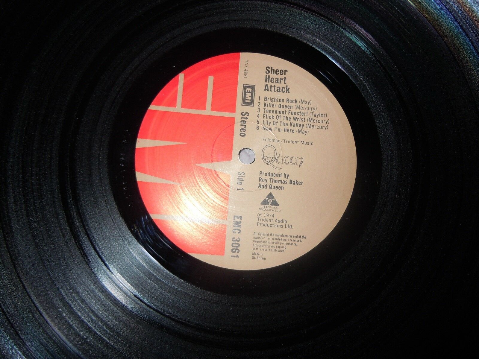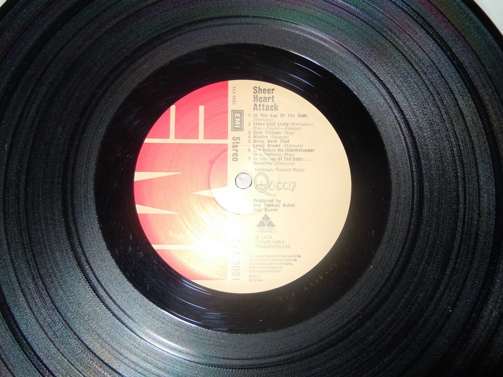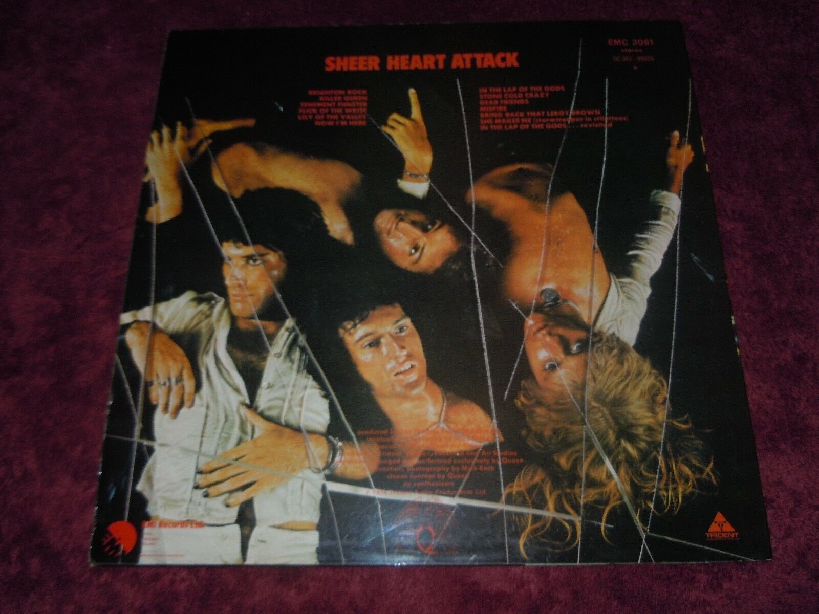 Queen’s Sheer Heart Attack 1974 authentic UK EMI Records EMC 3061 4/U/ 4/U with ’no synthesizers” on back cover and 1974 Trident Audio Productions as well as G&L on the inner (under crest design).
