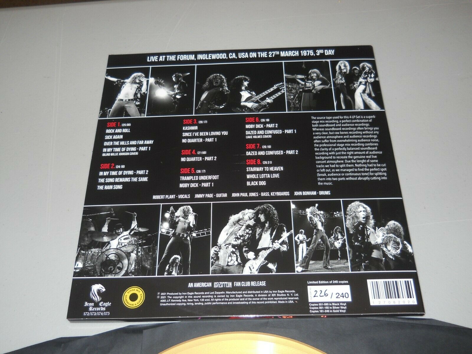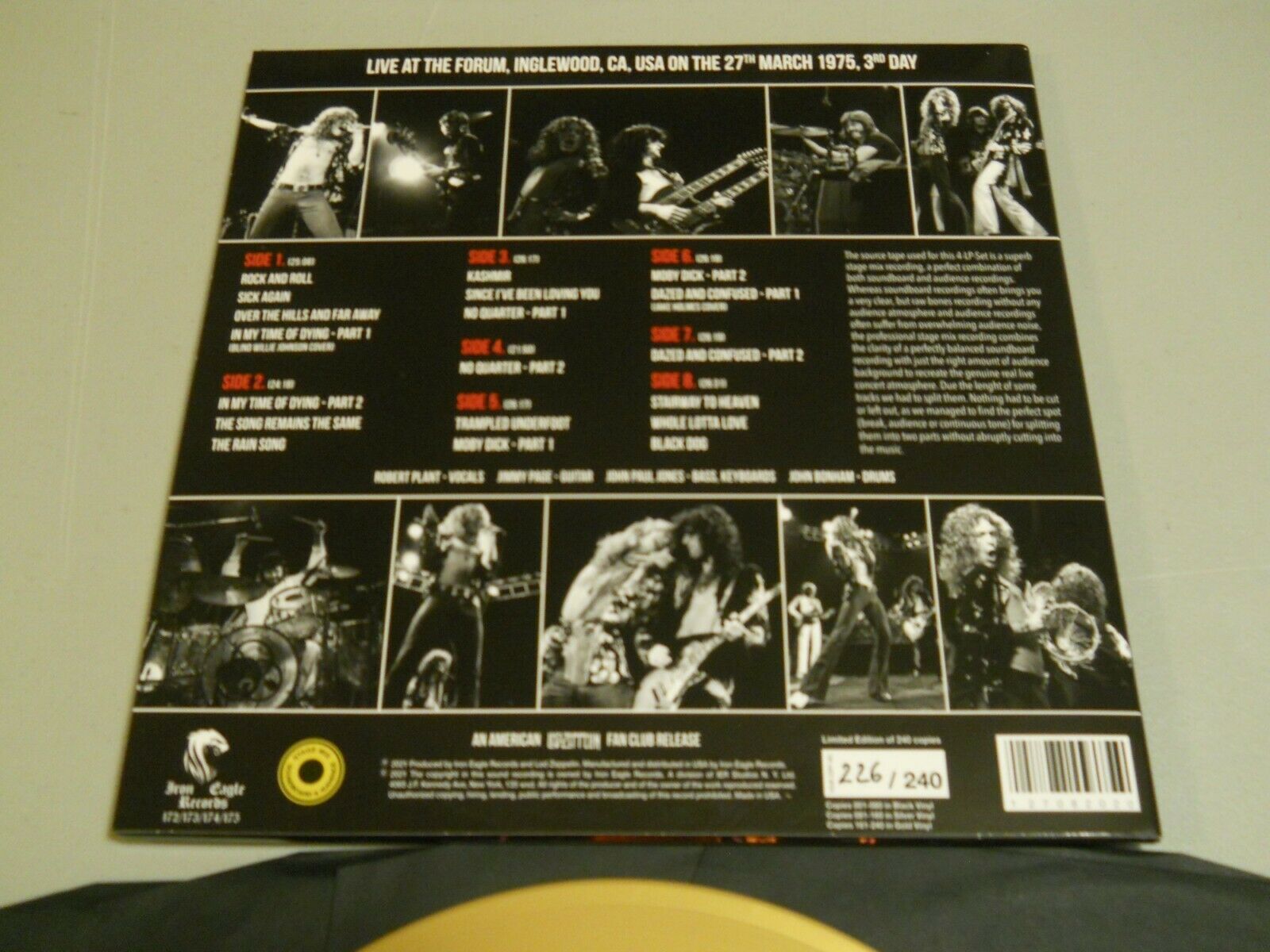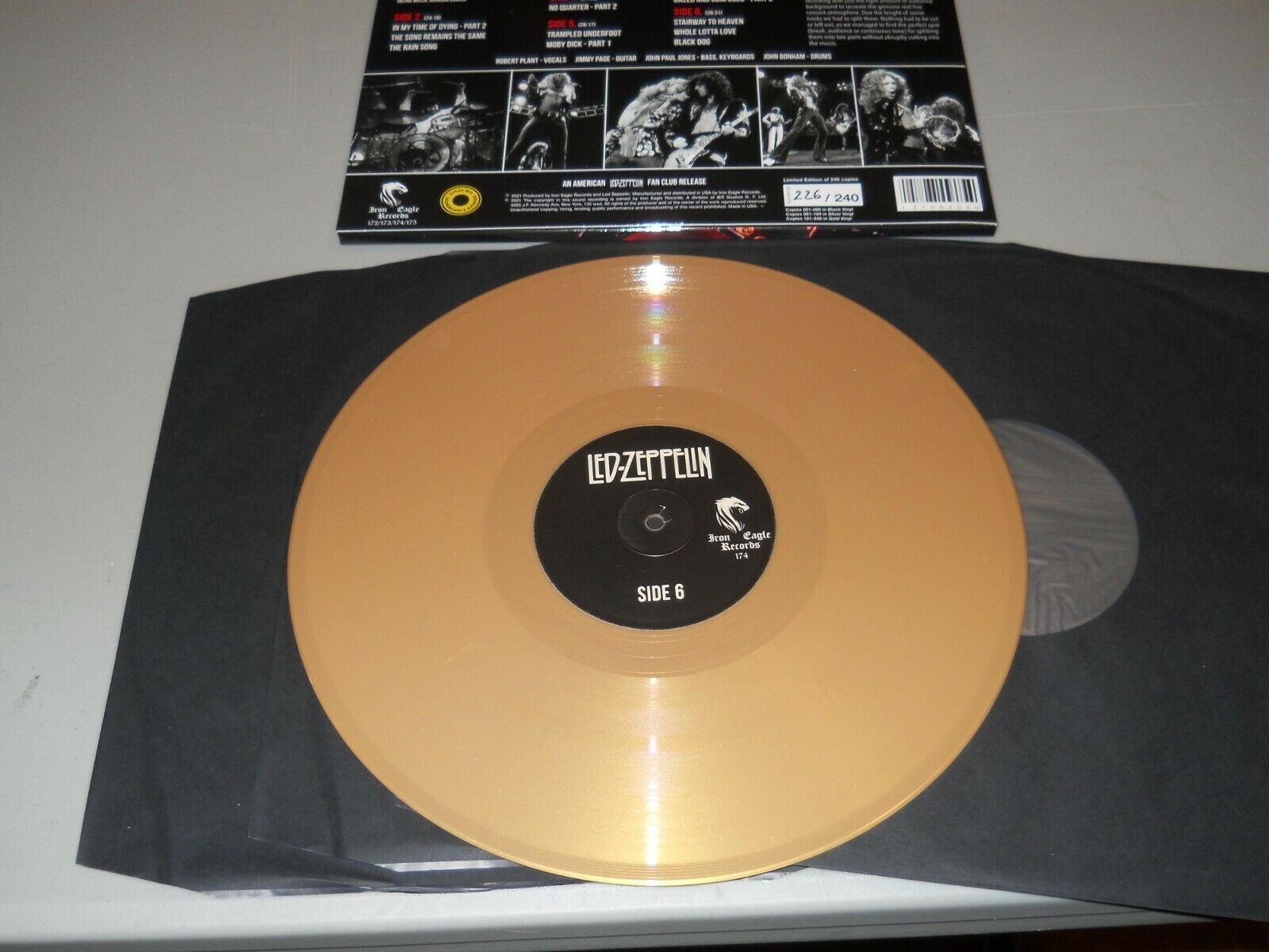 HI, FOR SALE IS A RARE LIMITED EDITION 4 GOLD LP SET FROM LED ZEPPELIN LIVE FROM INGLEWOOD CA, MARCH 27TH 1975 THIS IS #226 OF 240 THERE ARE 80 OF EACH COLOR BLACK SILVER AND GOLD, THIS IS THE GOLD EDITION SHIPPING WILL BE $5.00 MEDIA MAIL AND ALL SALES FINAL SO PLEASE ASK ANY QUESTIONS, THANKS