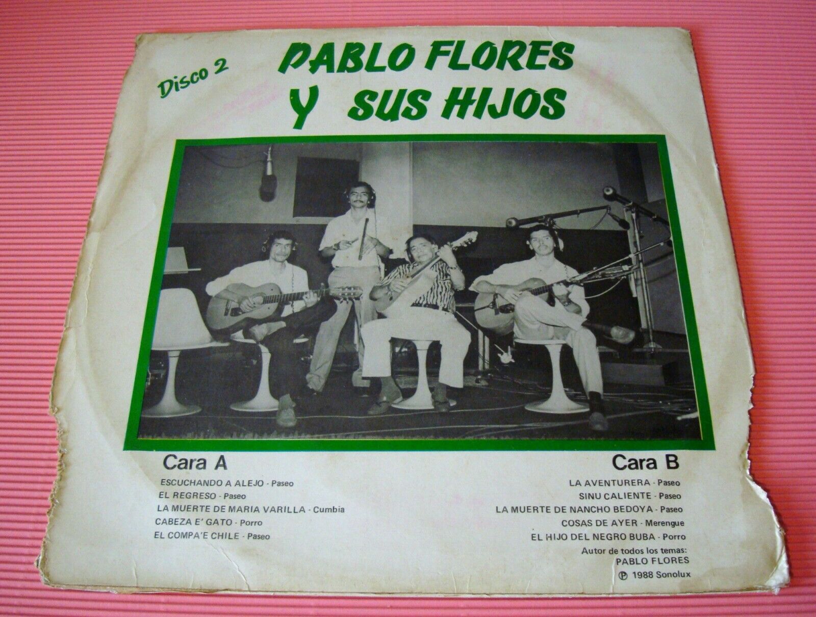 ?PABLO FLORES Y SUS HIJOS? SELLO PRIVATE, ORIGINAL PRESSED BY SONOLUX; SUPERB GUITAR CUMBIA BY THE LEGENDARY SABANERO MASTER, FORMER MUSICIAN OF THE MIGHTY ANTOLIN LENES, COMBO CIENAGUERO, ALSO MONTERIA SWING AND OTHERS! GREAT CUMBIAMBA SOUNDS BY THE GRAND: DON PABLO FLOREZ CAMARGO! VAYA EL SABOR!! ? VERY RECOMMENDED LP ? DO NOT MISS IT ? LAST COPY IN STOCK ??? MADE IN COLOMBIA ??? Note: a bit of both sides is recorded on the sample…. LISTEN !!!