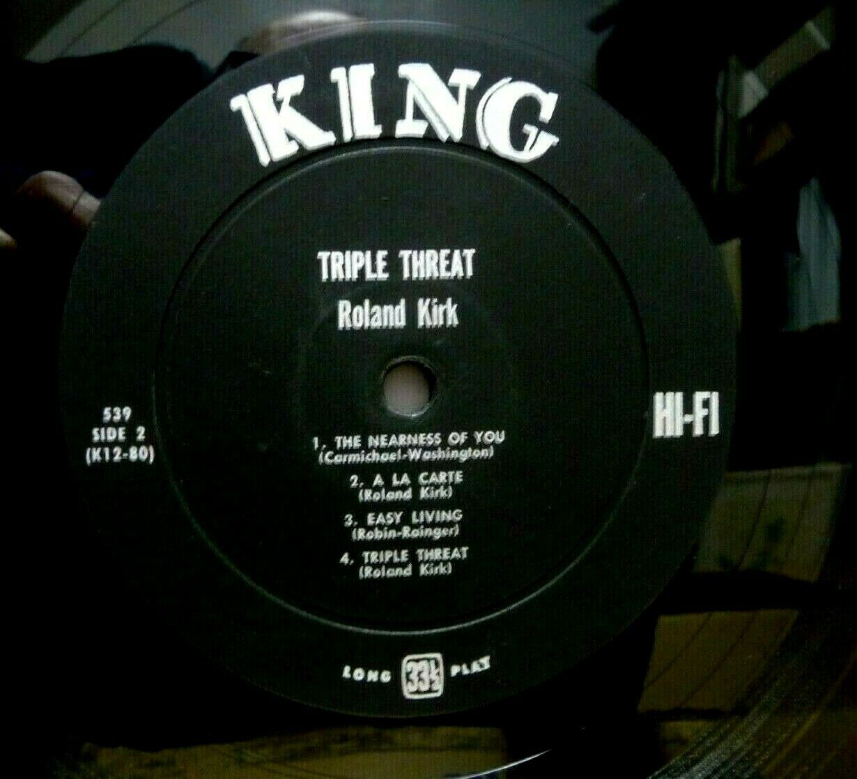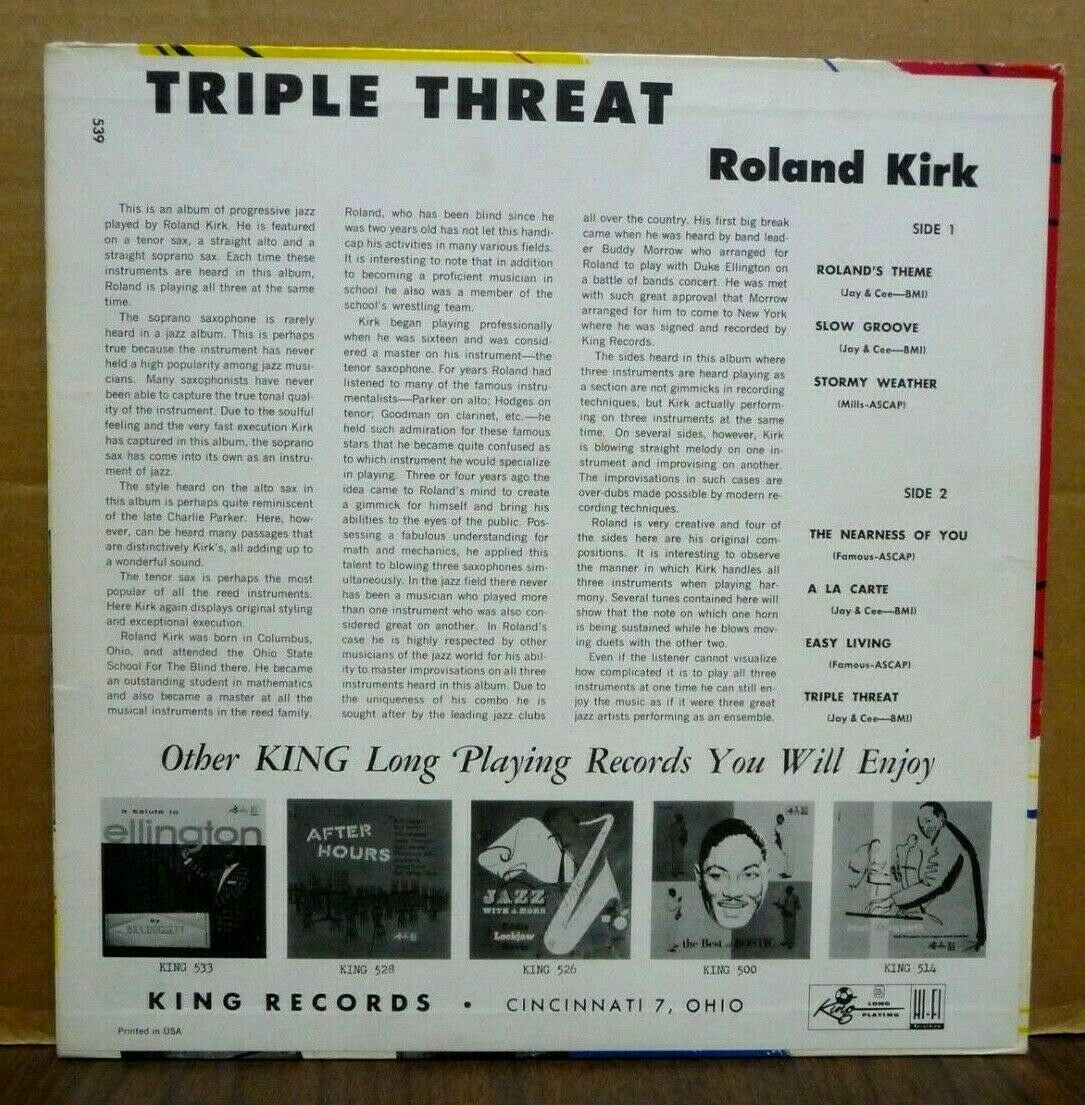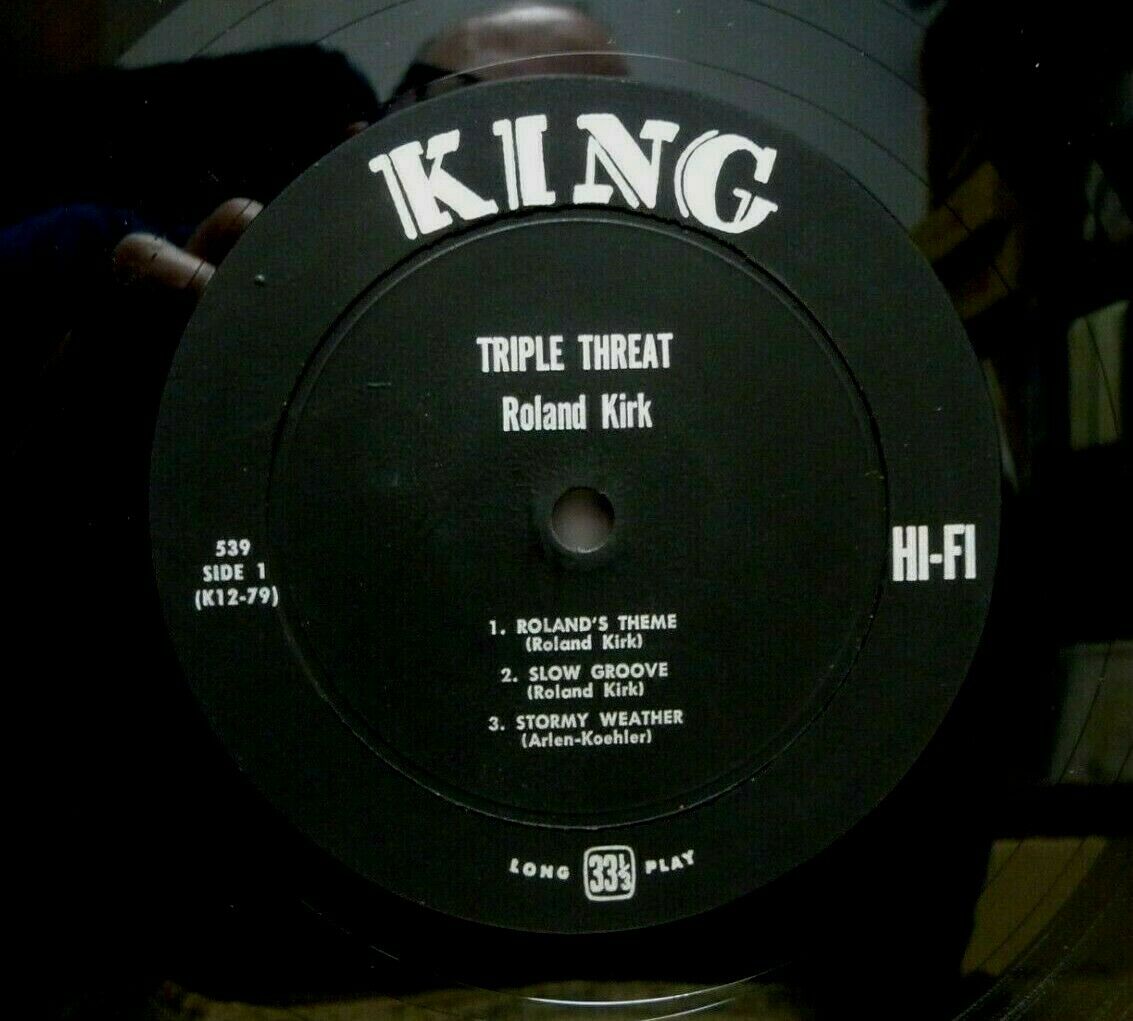 UP FOR AUCTION IS THE HOLY GRAIL OF AMERICAN JAZZ! ROLAND KIRK "Triple Threat" LP IS AN ORIGINAL 1956 PRESSING ON THE KING LABEL (MONO 539). THE HEAVY & GLOSSY VINYL, WITH A DOUBLE SIDED DEEP GROOVE LABEL & FLAT EDGE, IS IN VG++ CONDITION WITH A FEW SMALL NEEDLE DROP MARKS AND SOME SPINDLE MARKS ON ONE LABEL. THE VINYL PLAYS GREAT THROUGHOUT. THE AMAZING COVER IS IN EXCELLENT CONDITION WITH NO SEAM SPLITTING OR WRITING, DOES HAVE LIGHT SEAM AND SPINE WEAR AND SLIGHT WEAR AT THE CORNERS. THE GRAPHICS ARE SHARP FRONT AND BACK. THIS IS BY FAR THE NICEST PRESSING OF THIS OF THIS RARITY WE HAVE SEEN. SERIOUS BIDDERS ONLY! Cleaned on a VPI record cleaner. Stored in an audiophile inner sleeve. Please ask any questions before bidding. We ship internationally through Ebay Global Shipping and USPS priority express.