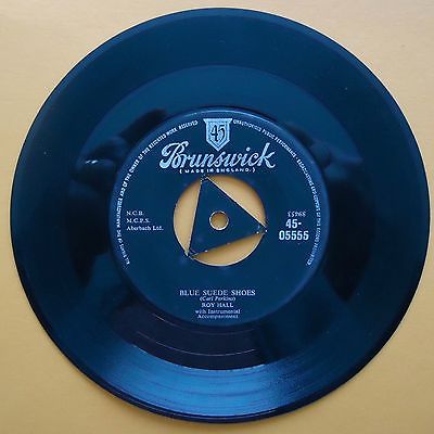 A CHANCE TO OWN A VERY RARE 1950'S CLASSIC ROY HALL'S VERSION OF BLUE SUEDE SHOES c/w LUSCIOUS ON BRUNSWICK 45-05555 TRI-CENTER Ex. cond. stamped on dead wax 45-894453-1C BH 1 ( on the A side ) stamped on dead wax 45-894455-1C BH 1 ( on the B side )