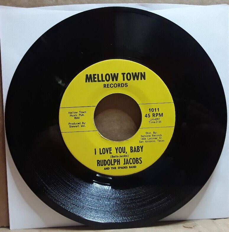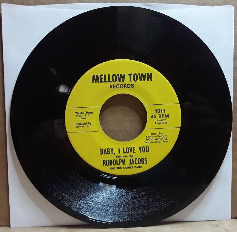 We are offering for auction an original pressing of the "Baby, I Love You" b/w "I Love You, Baby" 7" 45 by RUDOLPH JACOBS & THE SPADES BAND. This was released by the San Antonio, Texas based Mellow Town Records and is catalog # 1011.