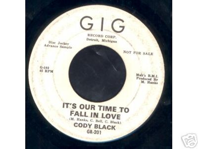 Rare Detroit Northern Soul 45 - Cody Black - "It's Our Time To Fall In Love"/"You'll Be Sorry" - GIG label - The record is in glossy VG condition. Record plays great! Labels are as shown. A VERY tough Detroit record to find. Shipping within the United States will be $4.00 and overseas will be $5.00. I accept Paypal and Western Union Bidpay.