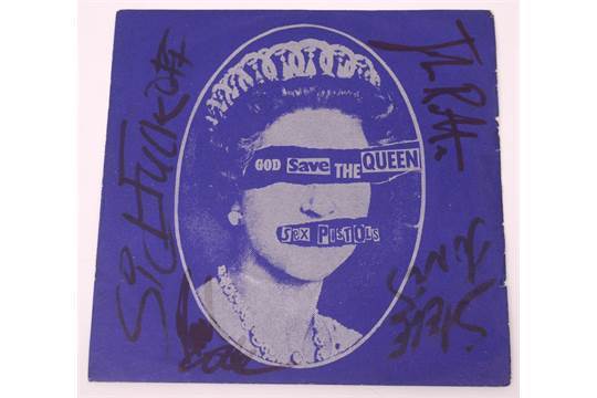 Sex Pistols 7" single 'God Save The Queen', iconic Jamie Reid artwork sleeve signed by Johnny Rotten, Steve Jones, Paul Cook and Sid Vicious and inscribed 'F@&k Off'.