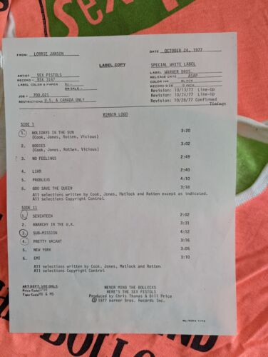 SEX PISTOLS - EXTREMELY RARE! A ONE-OF-A-KIND PRISTINE 1977 WARNER BROTHERS US TEST PRESSING (UNPLAYED)!!! THIS IS ONLY BEING OFFERED TO QUALIFIED US AND CANADIAN EBAY BUYERS. NO OVERSEAS SHIPPING CONSIDERED!