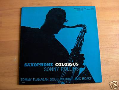Saxophone Colossus Sonny Rollins Four original Prestige PRLP-7079 mono LP. Flat edge pressing with deep groove yellow fireworks labels with 446 W. 50th St., N.Y.C. address and RVG on the trail-off wax. Back cover slick has Printed and Packaged by G E M Albums, Inc, N.Y. on the lower right corner. Sidemen are Doug Watkins, Max Roach, and Tommy Flanagan. Tunes are: St. Thomas\You Don't Know What Love Is\Strode Rode\Moritat\Blue 7.