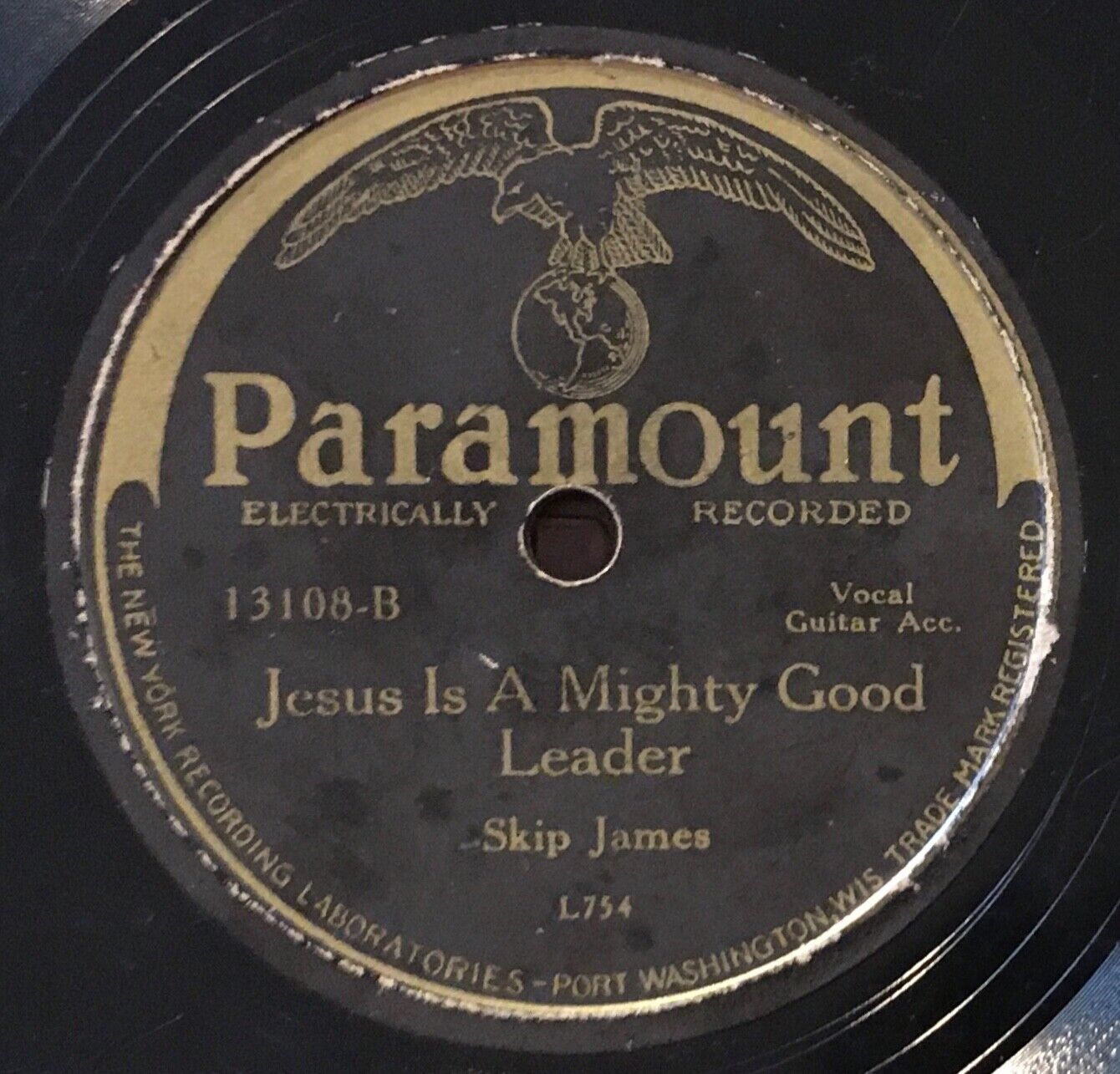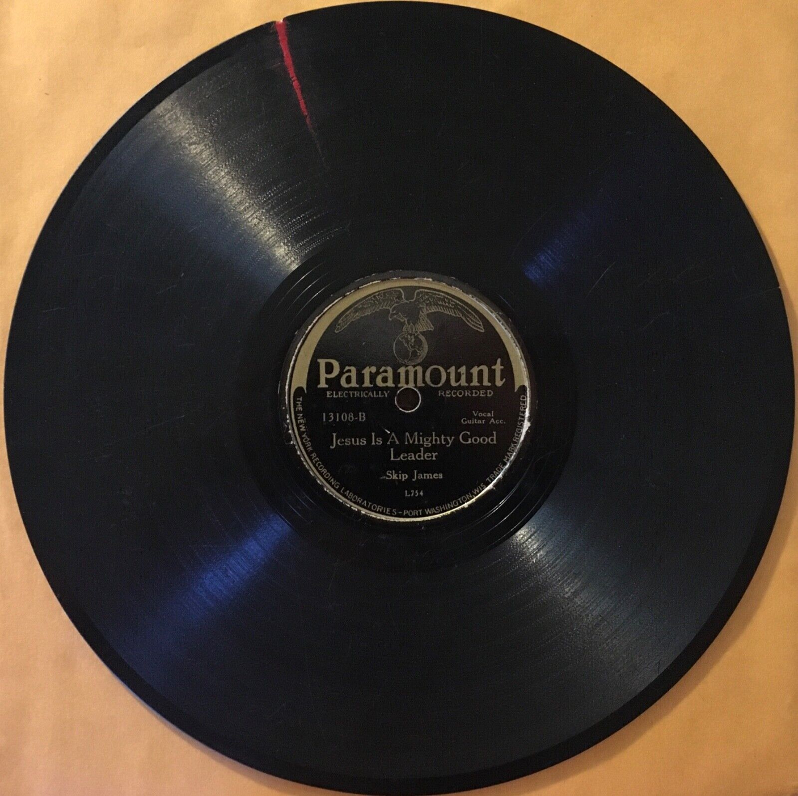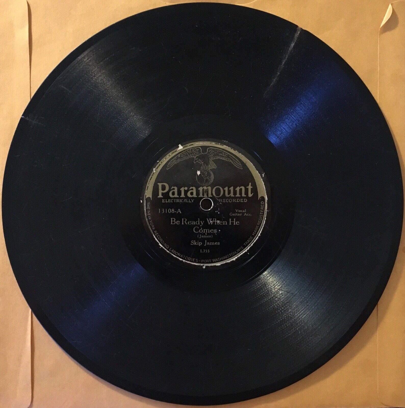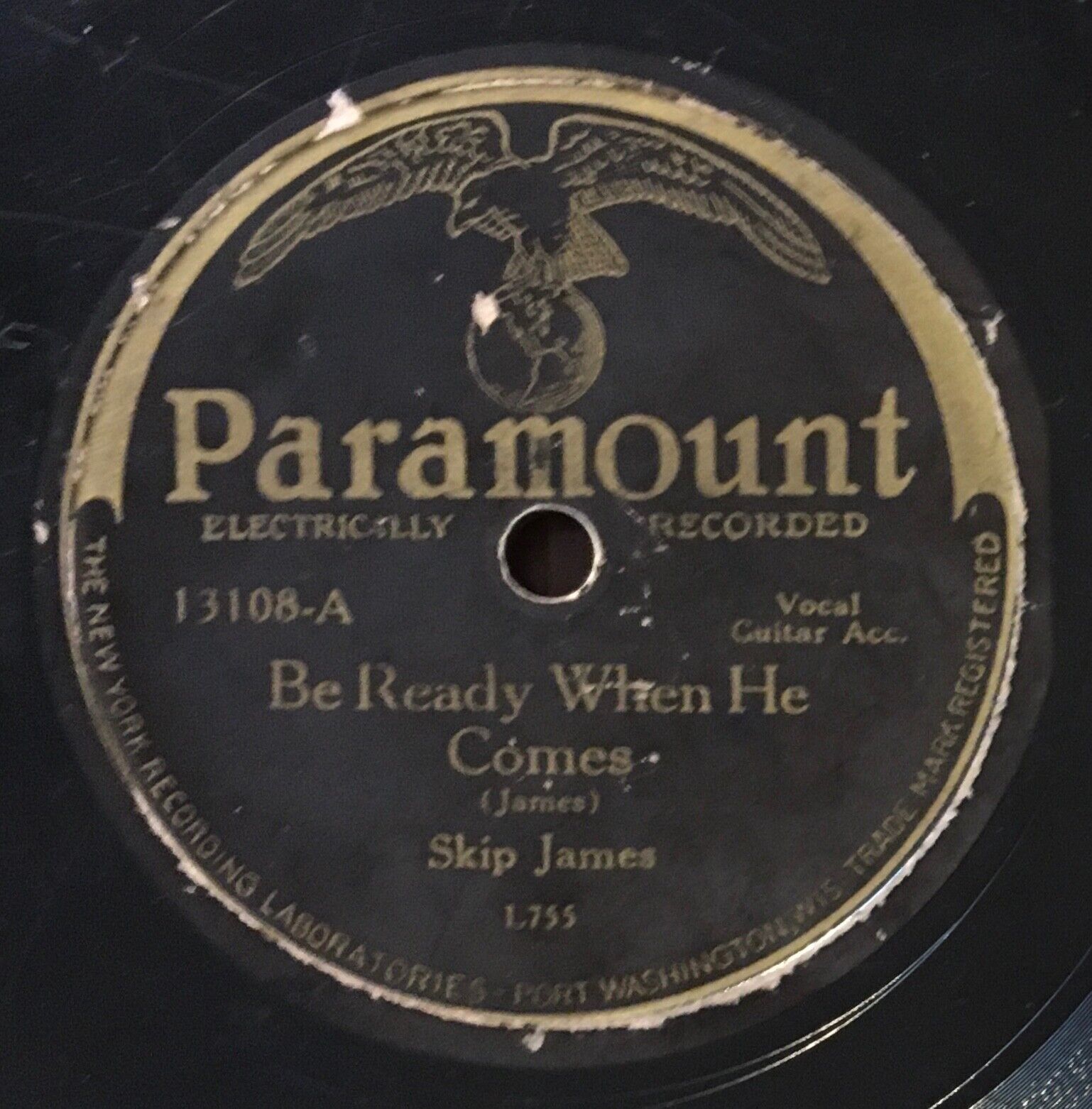 Hello! This is a listing for a copy of the extremely rare 1931 10" single Be Ready When He Comes/ Jesus Is A Mighty Good Leader by Skip James on Paramount, catalogue number 13108. Unfortunately, this copy isn't playable. It has a big gash in the side that at least as of now has rendered it impossible to play through without constant repeats and jumps. Attempts have been made to fix this wound with various waxes, but nothing has been effective, and it is highly recommended that no further attempts be made without extreme expertise on the matter and that this be treated only like a filler copy that is not to be played. Past the most obvious damage, this record has plenty of scuffing and scratching and a shorter repaired crack, which is a shame, because this is one of maybe 4 known remaining copies of this title, making it amongst the rarest records out there. Skip James releases are infamously difficult to find on shellac, and very few overall have survived in any condition, making the opportunity to own any very uncommon since most are packed away in collections. I truly wish this copy was in better shape. The labels are pretty decent, though, so at least it would display fairly well. As for shipping... this item will be sandwiched tight between 10" cardboard squares which will be taped closed, surrounded in bubblewrap or something similar, and then placed in a box that will itself be placed in a bigger box that will also be full of a cushioning substance, and then the whole package will be shipped Priority with signature required and with full insurance, all on my dime. I know how to pack shellac and do not take the task lightly, especially with items like this. I hope this record goes to a good home and is treasured as it should be.