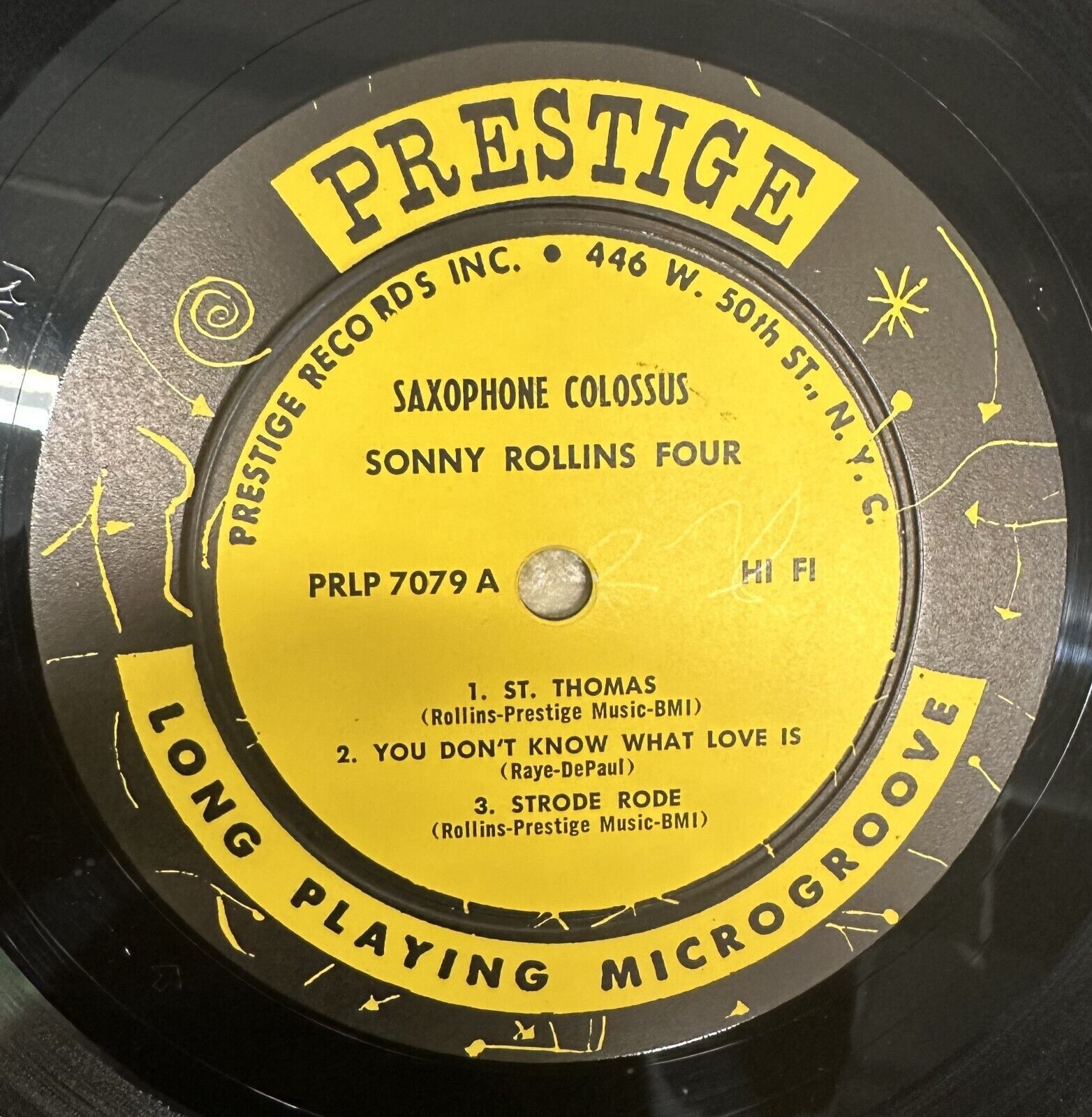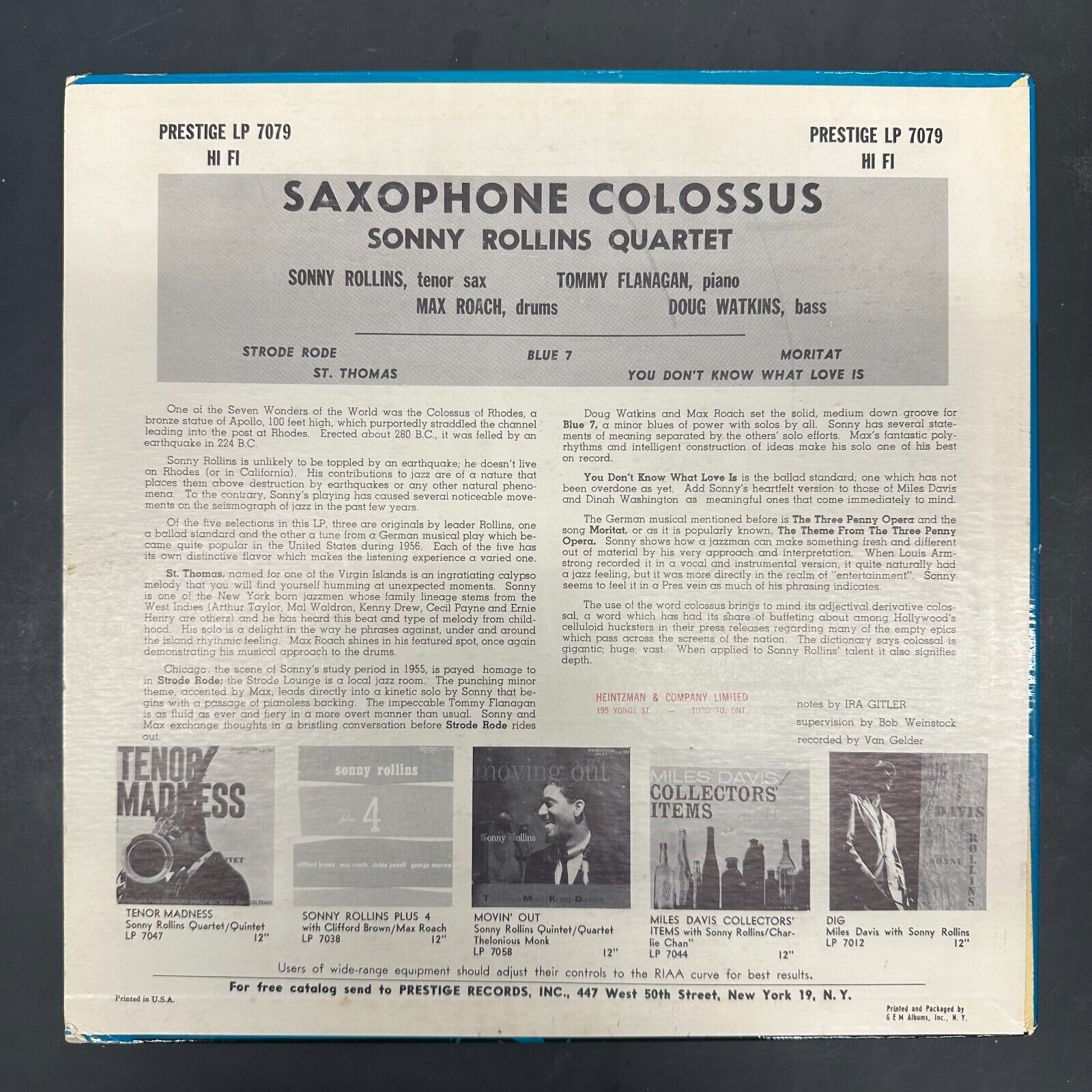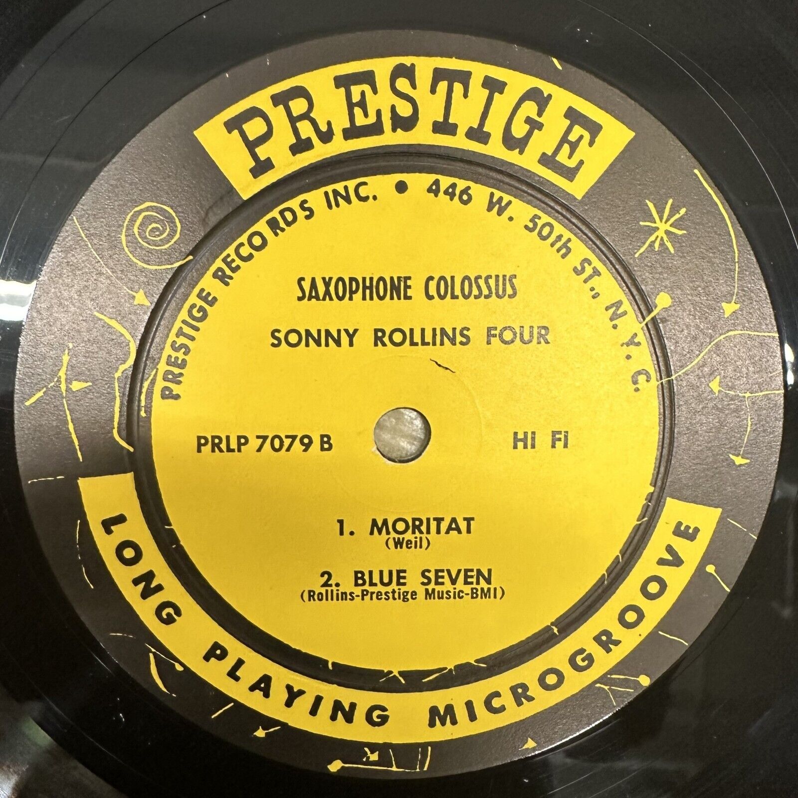 This is the original deep groove RVG-etched pressing of Sonny Rollins “Saxophone Colossus” on the West 50th St. labels of Prestige PRLP 7079. The playing surface is in near-new condition, with a beautiful luster; perhaps played once. The laminated West 50th St. cover is bright and clean throughout; 3/4” split/bump on the top seam, at the opening; the bottom seam has 3/8” wear at the spine and 1” wear/bump at the opening; slight lamination lifting (no flaking) at the top of the opening, on the front. Original glassine inner sleeve is included. Personnel include Tommy Flanagan, Doug Watkins, and Max Roach. $500.00.
