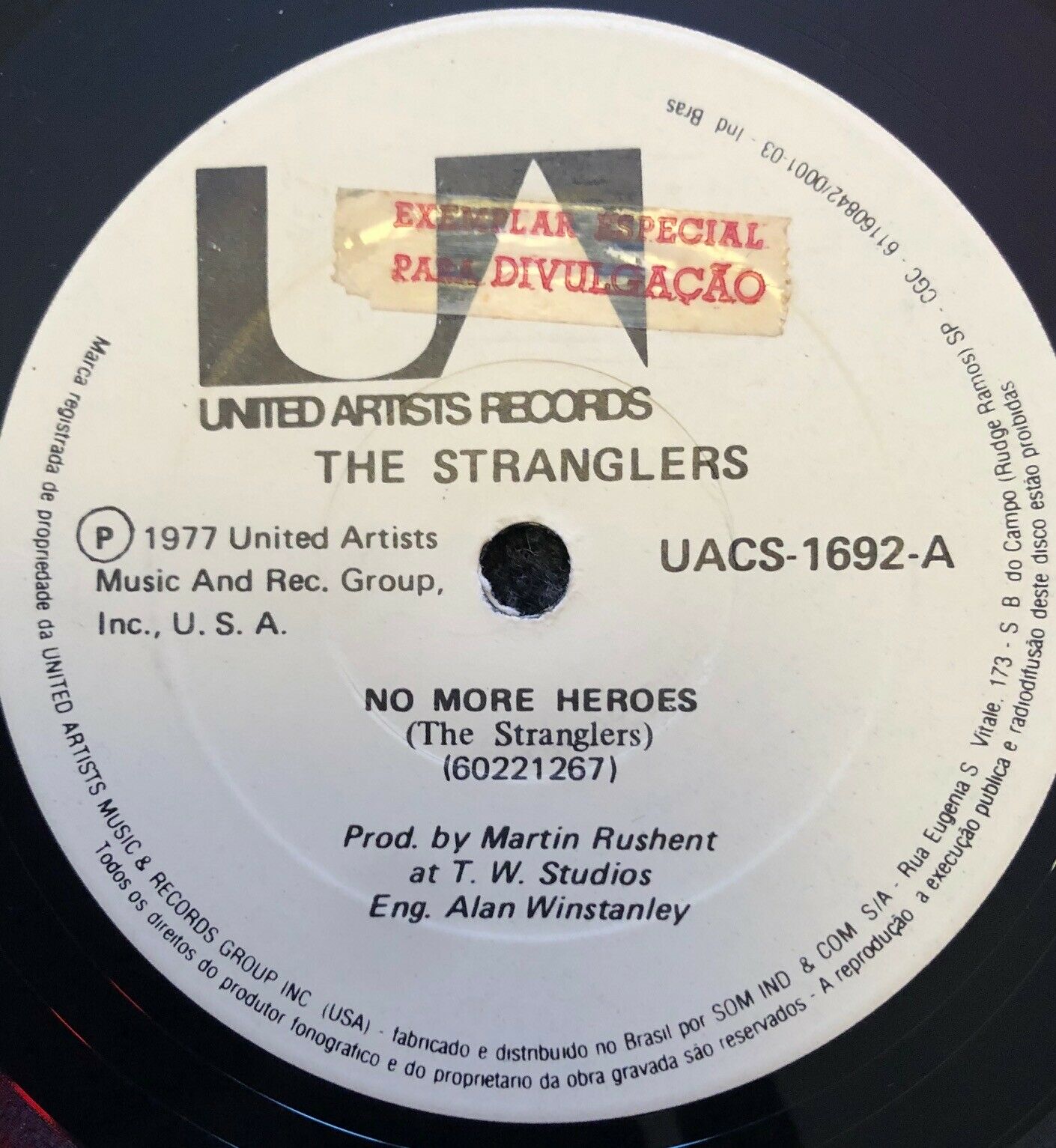 THE STRANGLERS 'NO MORE HEROES / IN THE SHADOWS' MEGA RARE BRAZILIAN IMPORT DJ PROMOTIONAL 7" WITH NICE DIFFERENT PICTURE SLEEVE AND RADIO PROMO STICKERS INCL. DATE 19/12/1977 (STAMPED & STICKER) & BRAZILIAN STICKER ON LABELS. UNITED ARTISTS 1977. UACS-1692-A. IN STUNNING CONDITION AND THE BEST I'VE EVER SEEN/HAD!