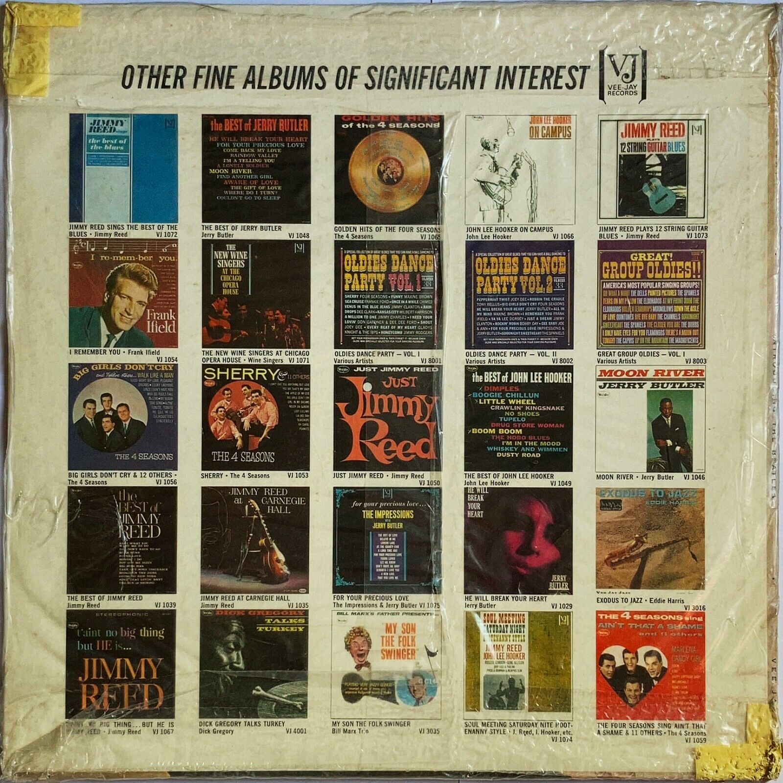 This beautiful copy features the so called "Ad Back" on the back cover consisting of 25 other Vee-Jay albums released at the time. "Printed in U.S.A." is present on the far left side of the front cover which is unique to version 1 copies. The cover sleeve is still enclosed in its original Sears Roebuck and Co. outer wrapping which has nicely preserved it the past 65 years. Unfortunately the outer wrapping seems to be sticking to part of the back cover which prevents it from being easily removed. Perhaps some heat or steam could dissolve the glue enough for the cover to be removed if desired. The cover has no splits at all and I would almost grade it NM- if it weren't for some small minor marks in the bottom corner where the outer wrapping has ripped (see image 5) and the aforementioned glue issue on the back. Otherwise there is little yellowing or even any ringwear to speak of. The cover appears worn from the images but this is actually the outer wrapping. The cover inside is VG+ as stated.