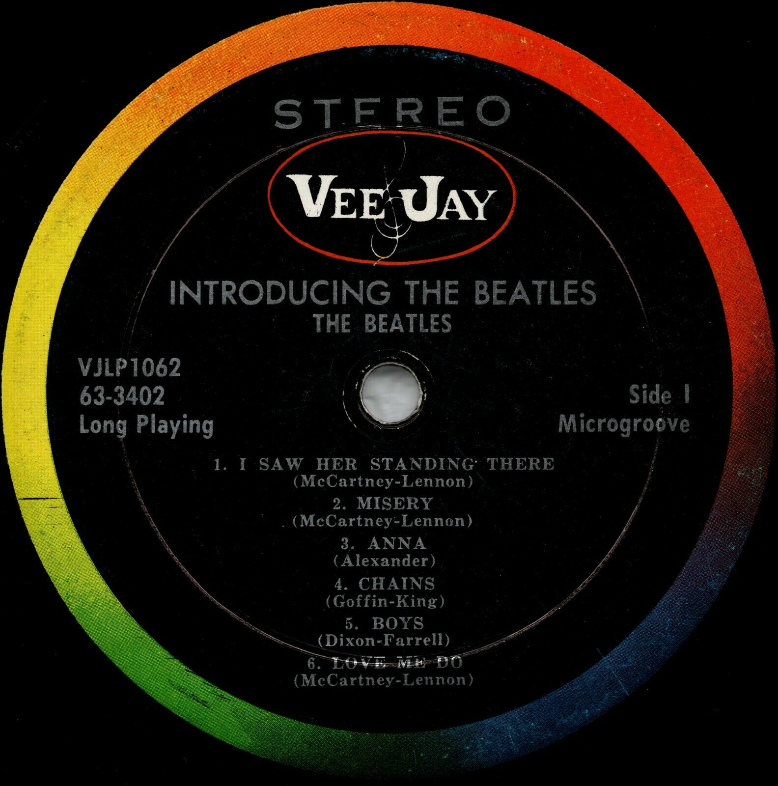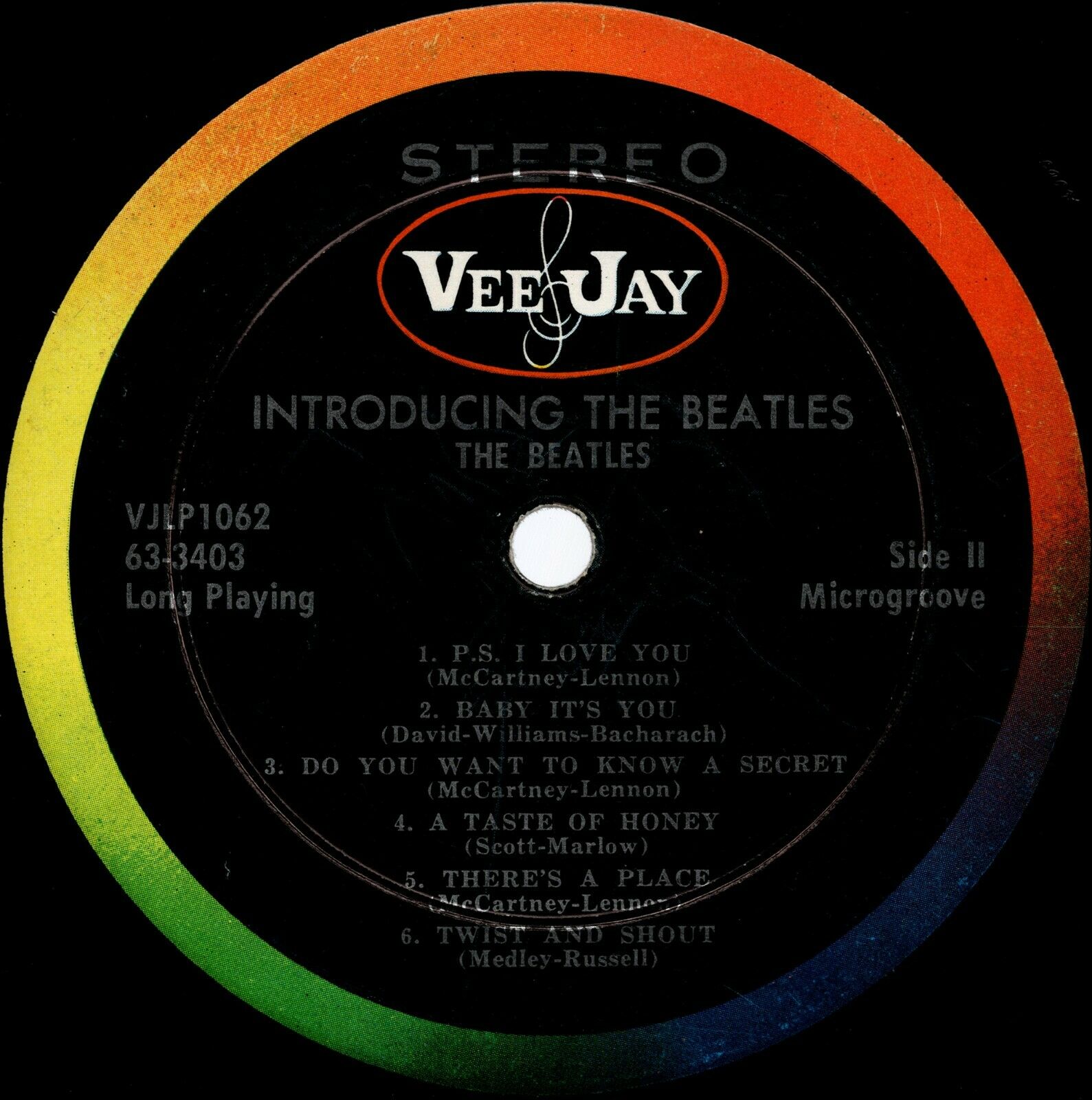 Now on to the LP. The record is a matching version one stereo pressing. The LP only grades VG because of the typical light scratches a 60+ year old LP has. Thankfully the record plays much better than it looks with barely any surface noise and no skips. The groove wear is negligible for a record of this age also; it's clear this copy was taken good care of. The stereo separation is surprisingly very good except for Love Me Do and P.S. I Love You which use the same fake stereo mixes as the stereo UK Please Please Me album. The LP labels are the colorband variation with oval "VEE JAY" logos and "STEREO" across the top in sans serif font. The images are scans of the actual labels. The matrix numbers are as follows: Side 1: 63-3402S Side 2: 63-3403S Both sides have the "AudioMatrix" stamp as well as the cursive "ARP" which make this an American Record Pressing Co. pressing.