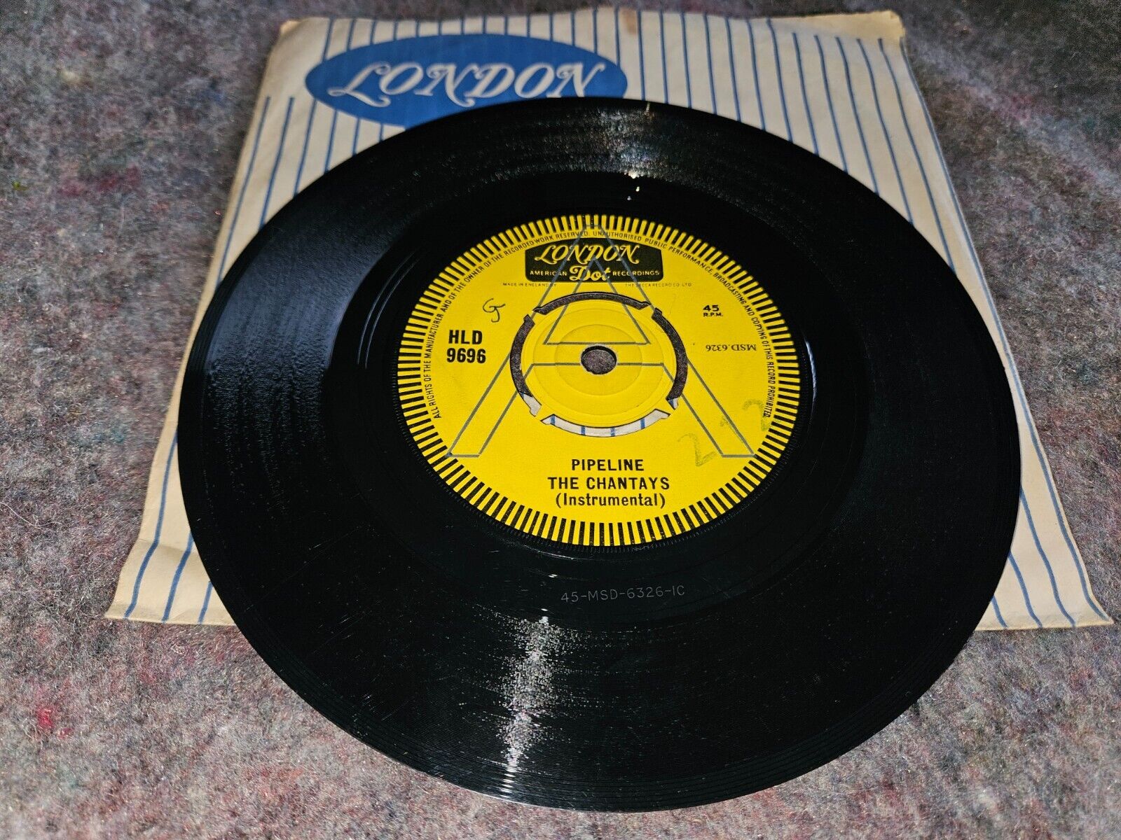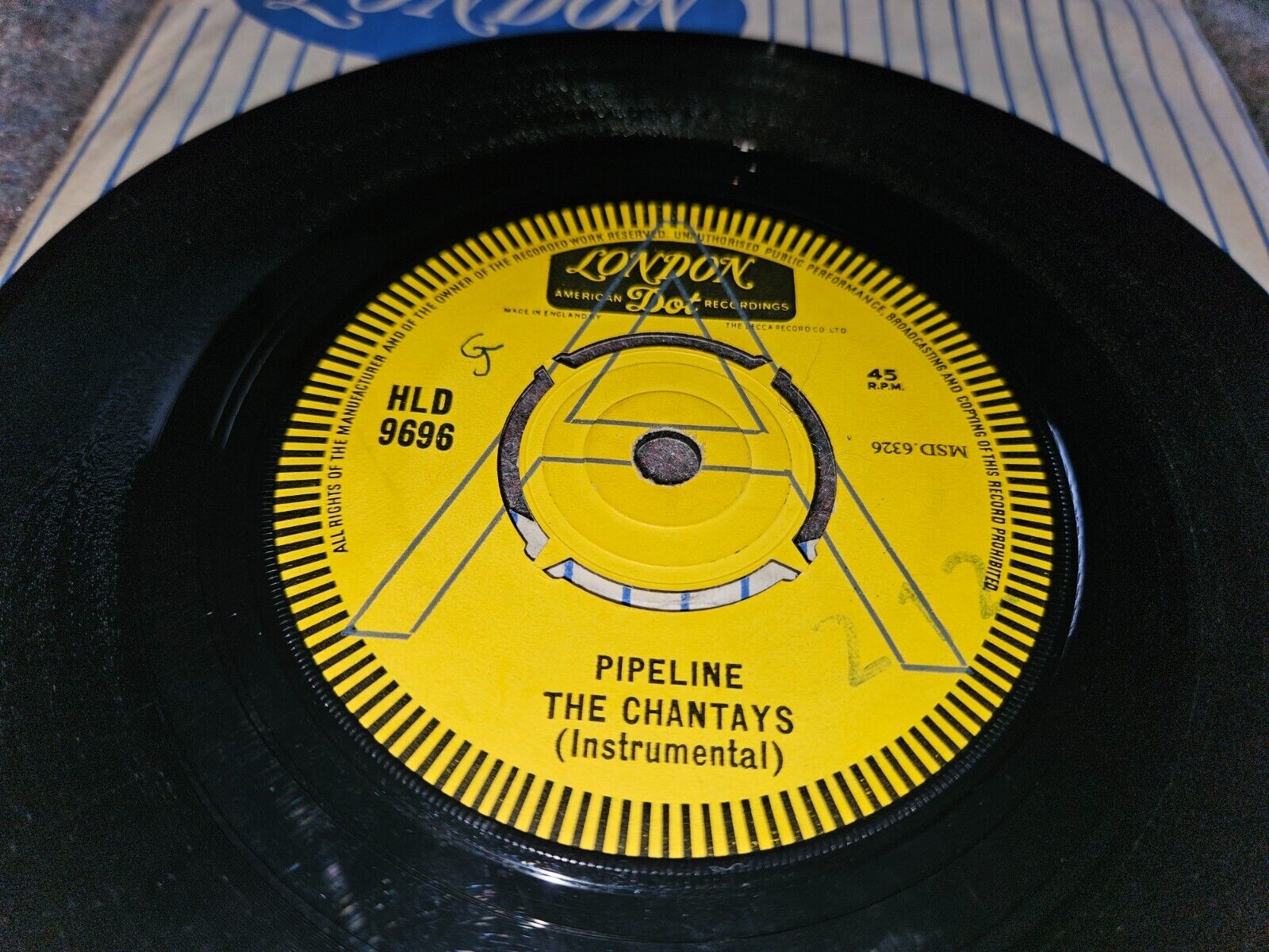 THE CHANTAYS -PIPELINE-RARE 1962 SURF UK LONDON DOT HLD 9696 A LABEL DEMO 45-Ex+
