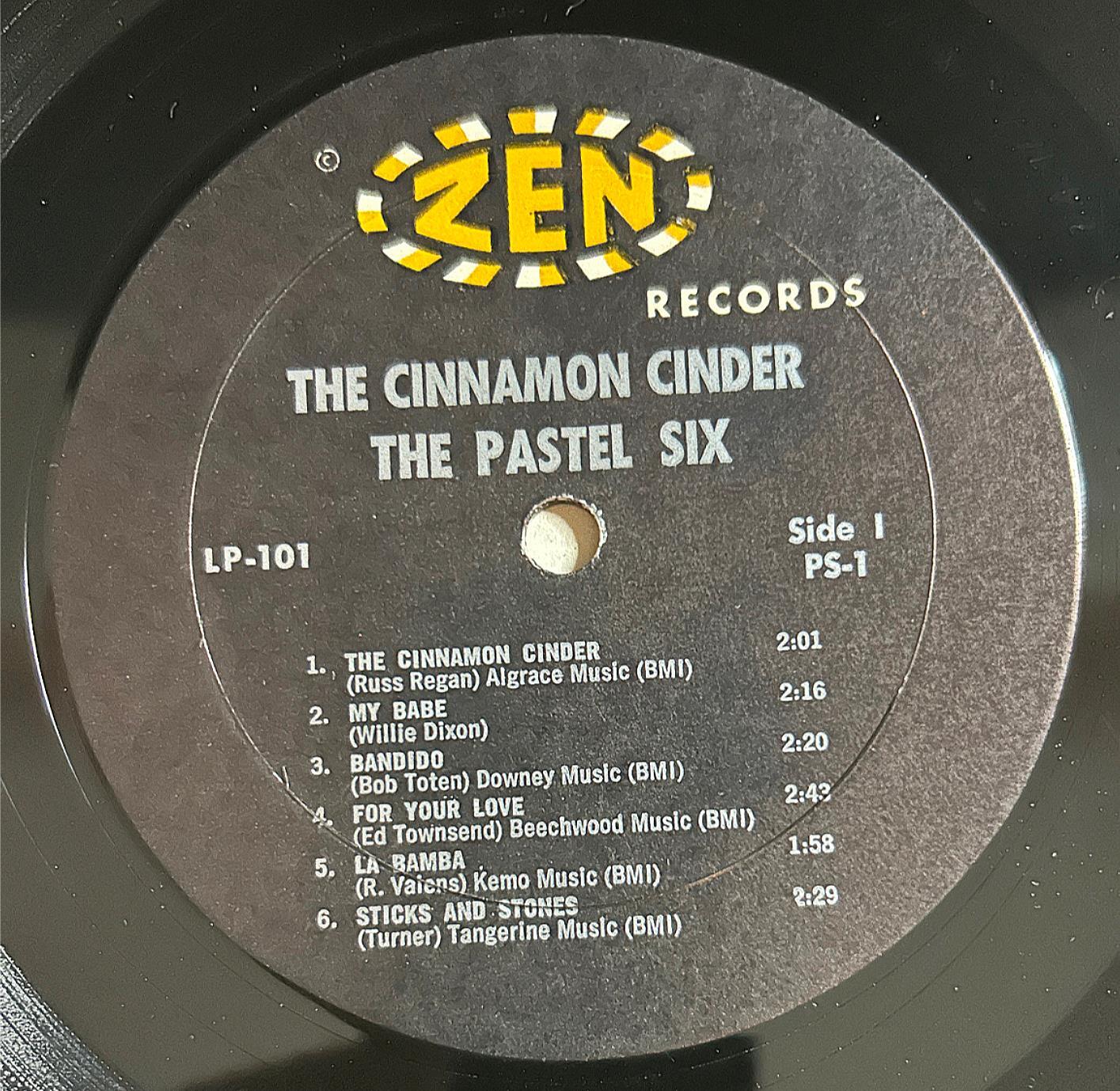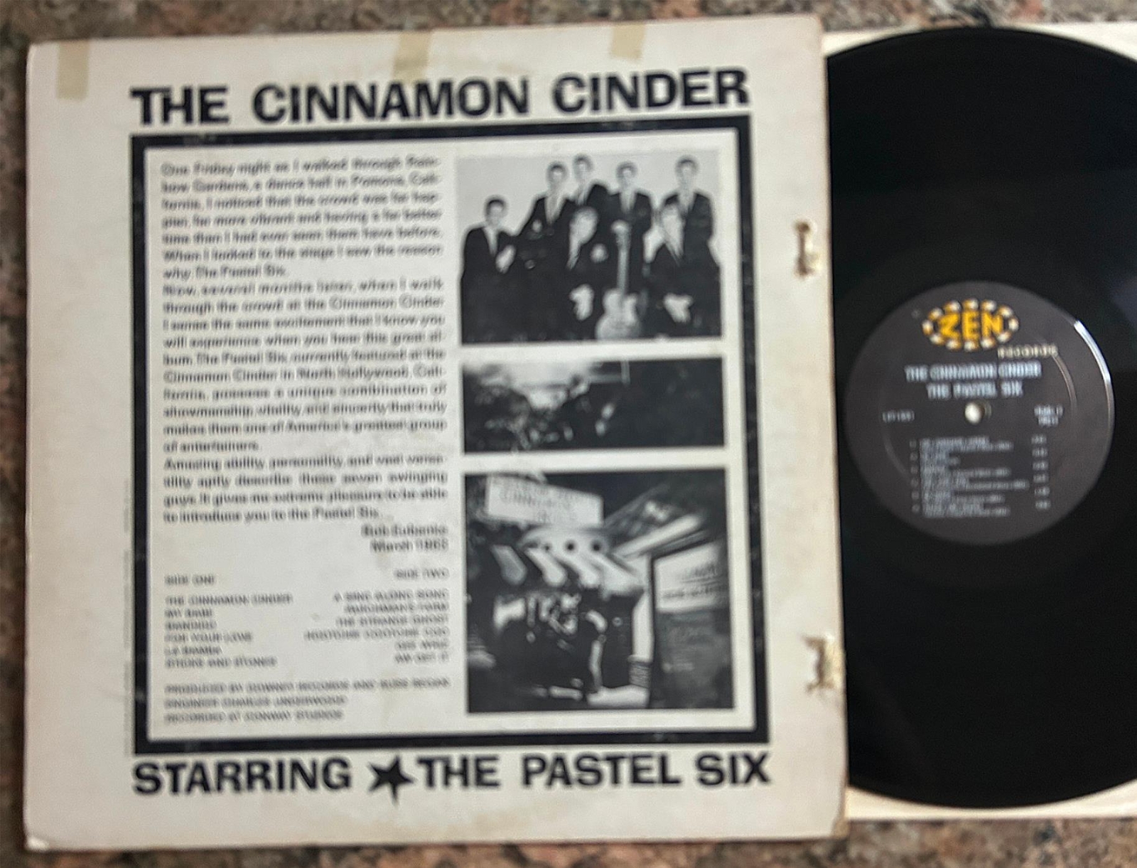 Bob Eubanks owned a club in North Hollywood called the Cinnamon Cinder that featured the Pastel Six as the clubs Resident Band. This album was released to introduce the band to a broader audience and promote the club. See the back cover slick for more information and photos of the club. The original ZEN LP is very difficult to find as there were not many produced back in 1963. I have had it in my garage/surf collection for many years.