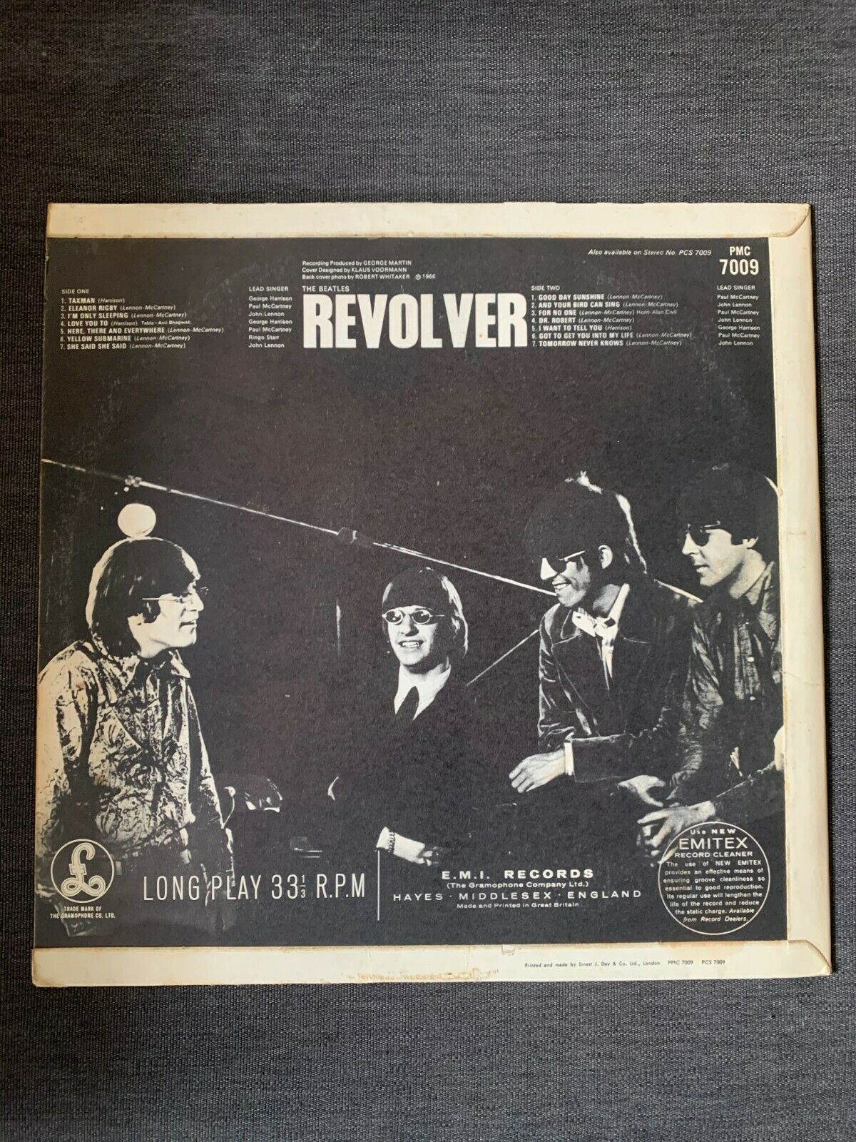 Revolver , original 1966 mono pressing (PMC 7009), rare withdrawn version with original "Remix 11" mix of "Tomorrow Never Knows", original yellow & gold Parlophone labels, matrices XEX 605-2 / XEX 606-1, "Dr. Robert" credit on sleeve and labels, rare laminated flipback sleeve printed by Ernest J. Day & Co Ltd,