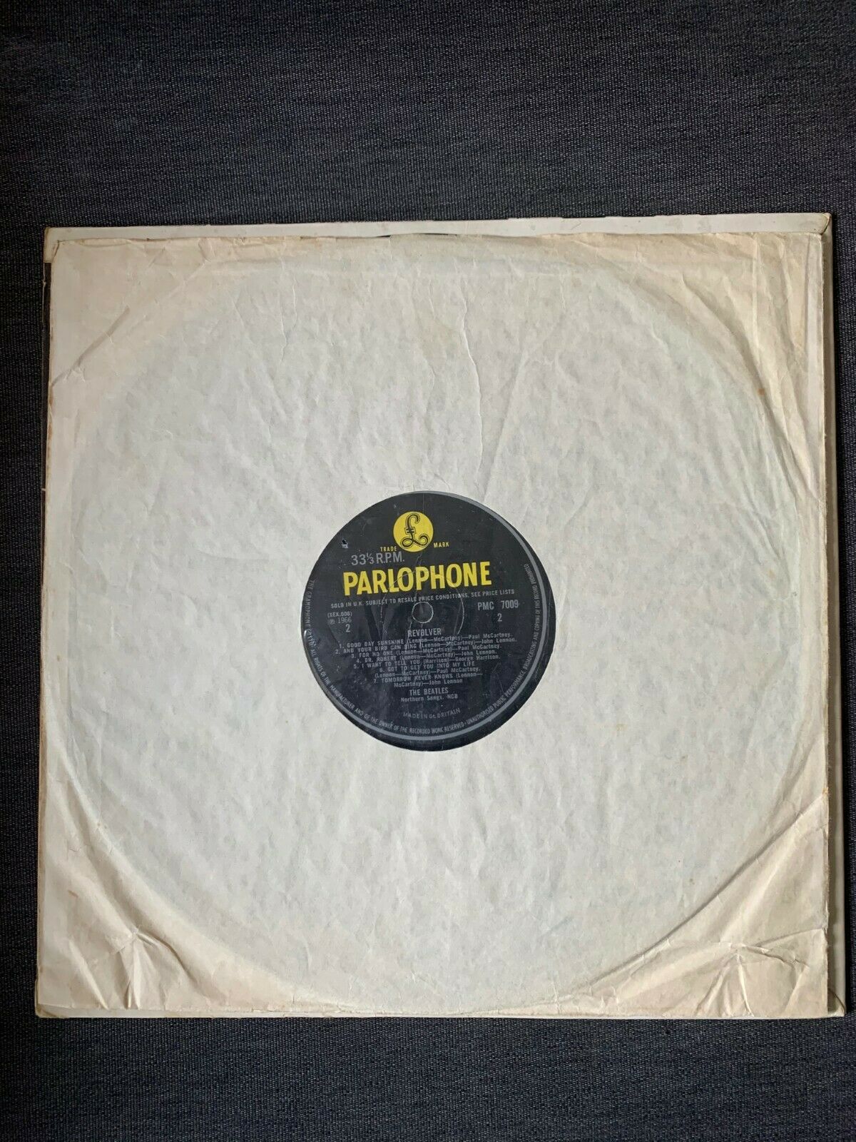 There are some surface scratches on the LP but they don't affect playing. I listened to the whole LP this morning and it plays well. Please see the photos for the condition of the sleeve. There are some marks on the front and above and to the left of the title "Revolver" and the laminate has been scratched and some removed over the actual word "Revolver". The inner sleeve is open on two sides instead of one.