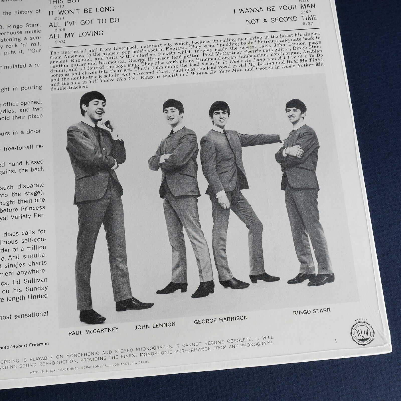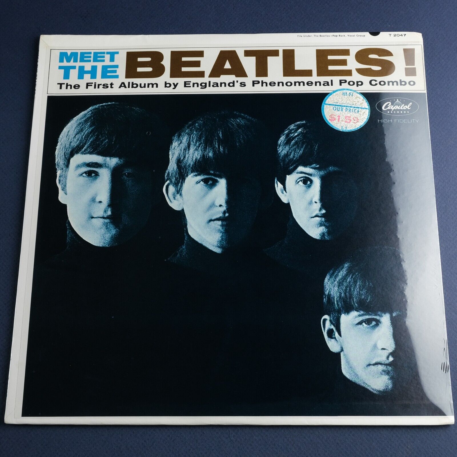 Up for auction is a very early 1st US Mono pressing copy of The Beatles’ 1st studio album “Meet the Beatles!” released by Capitol Records on January 20, 1964. For 60 years, this copy has remained factory sealed. Finding a copy like this is incredibly hard. If you’re a collector than I’m sure you understand how hard it is to be parting ways with it. This factory sealed copy contains a 1st print cover with the dark brown “Beatles” title at the top which can be found on the very early copies pressed in January~February 1964. The back cover has one more identifier of the 1st pressing, which is the absent “George Martin” producer credit at the bottom left corner. The front cover still retains an original record store “Hi-Fi” sticker with the $1.59 price. The factory shrink wrap remains fully intact containing two breathe holes on each side of the album. When The Beatles released their 1st album in the early 1964, Capitol Records used a blue inner sleeve of royal blue color. It’s this inner sleeve that can be seen through the fully intact shrink wrap at the mouth of this copy’s cover. By the middle of the same year Capitol already replaced it with another inner sleeve of brighter blue color. Based on the RIAA 3 identifier located in the lower right-hand corner of the back cover, this copy represents the East Coast release pressed at the Capitol Records plant in Scranton, PA.