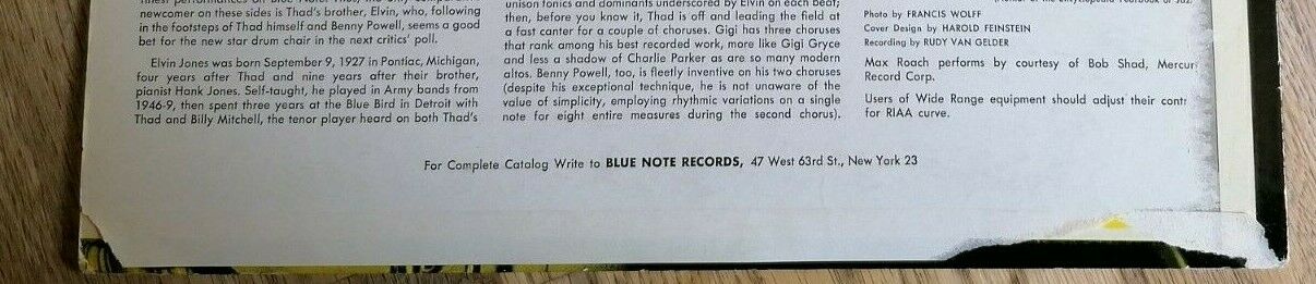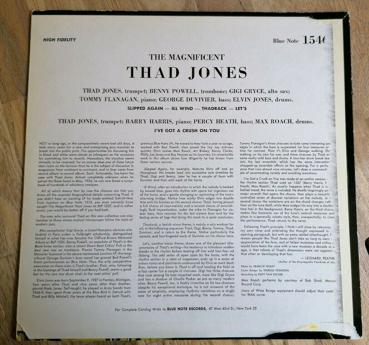 Thad Jones LP The magnificent Thad Jones FOR ME HAS TO BE IF NOT THE RAREST CERTAINLY IN TOP 3 IF NOT IT SIMPLY NEVER TURNS UP Label:USA Blue Note Mono Correct 1st Press WITH RVG ON BOTH RUN OFFS ALONG WITH THE EAR,DEEP GROOVE LABELS,CORRECT 47 WEST 63RD NEW YORK 23 SO ABSOLUTE CORRECT MONO 1ST PRESS Catologue number:BLP 1546 Vinyl grades:BEAUTIFUL EX AMAZING TO FIND A 64 YEAR OLD RECORD IN THIS CONDITION Sleeve grades:NO TEARS ETC BUT THERES A PROBLEM WITH BACK COVERRIGHT SIDE EDGE FRAME AND BOTTOM EDGE FRAME SEE PICTURES IVE PHOTOGRAPHED IT NOT TORN AS YOU CAN SEE CAUSE OF THIS IM GRADING VG USE ZOOM TO SEE PLAIN WHITE INNER