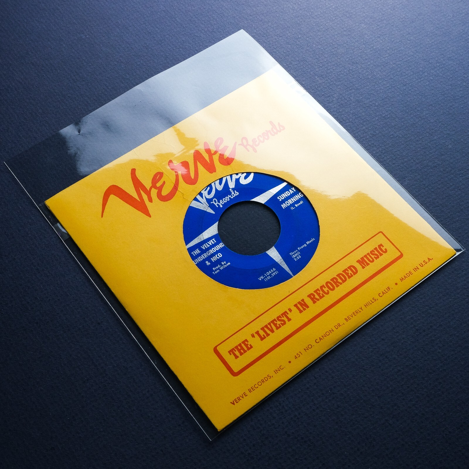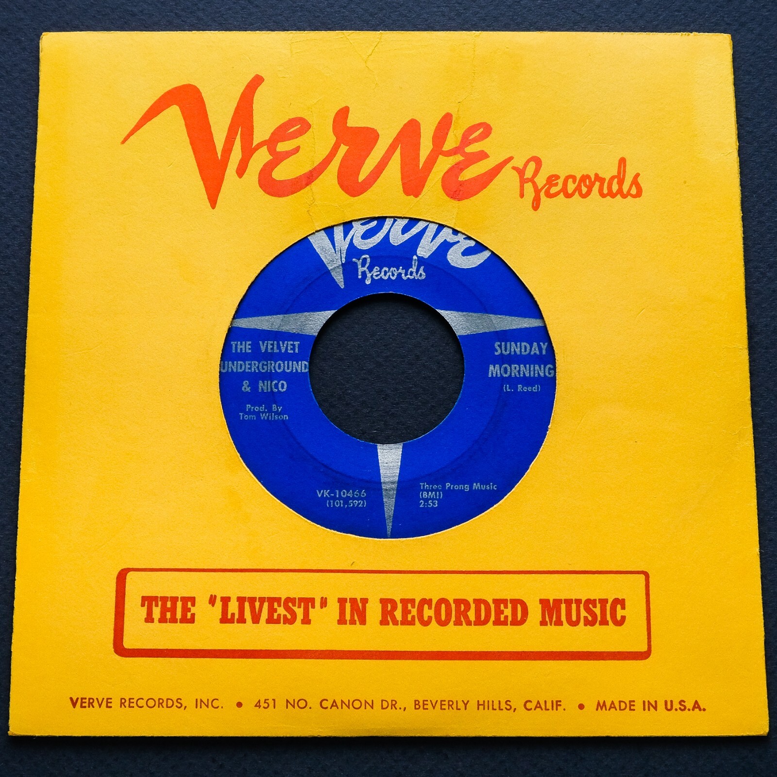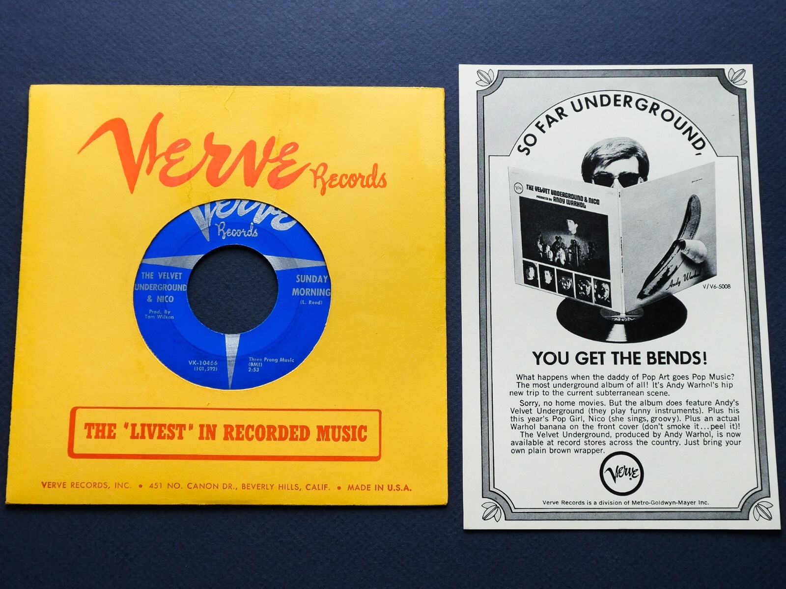 Incredibly rare 1st US pressing of The Velvet Underground & Nico’s 45 RPM 7” single with 2 tracks “Sunday Morning / Femme Fatale” released in December, 1966. This commercial issue with the dark blue Verve Records labels is one of the rarest and most collectible releases of The Velvet Underground & Nico and comes across much rarer than the promotional release of this issue with the pale blue “Special Disc Jockey Record” labels. In late 1966, "Sunday Morning" was the final song to be recorded for The Velvet Underground & Nico. It was requested by Tom Wilson, who thought the album needed another song with lead vocals by Nico with the potential to be a successful single. The final master tape of Side 1 of the album shows "Sunday Morning" only penciled in before "I'm Waiting for the Man". The “Femme Fatale” track, which was also included into the debut album, was composed by Lou Reed at the request of Andy Warhol and dedicated to his superstar Edie Sedgwick. The currently listed 45 RPM record was pressed by MGM Records in Bloomfield, New Jersey. Original 1st print “Made in U.S.A.” Verve Records “Produced by Andy Warhol” VK-10466 blue labels with silver print containing the “MGM Records – A Division of Metro-Goldwyn-Mayer, Inc.” credit. Pressed at the MGM Records plant in Bloomfield, New Jersey, the vinyl contains the 1st pressing matrix numbers including the block looking “S” symbol on both sides: Side 1 (Sunday Morning) - VK 10466 101592-1 I I Block-Looking "S"; Side 2 (Femme Fatale) - VK 10466 100903-1 I I Block-Looking "S". This copy comes with the original yellow sleeve with the red Verve Records logo, “The ‘Livest’ in Recorded Music” banner and “Verve Records, Inc. 451 No Canon Dr., Beverly Hills, Calif. Made in U.S.A.” credit. Included in this listing is a rare original 1967 Verve Records “So Far Underground, You Get The Bends!” promotional advert. It measures 5” x 8” and contains a photo of Andy Warhol with the LP cover of “The Velvet Underground & Nico” placed on the top of the vinyl record in front of him.