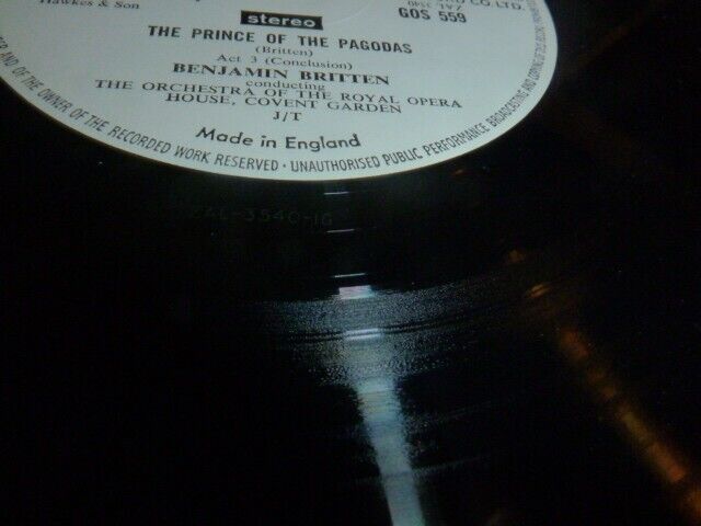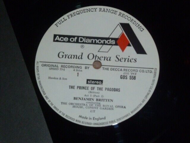 UK ED1 Decca GOS 558-9 Britten: Prince of the Pagodas from the ROH Covent Garden Orchestra conducted by Britten. Probably the finest of all British Ballet scores, wonderful textures and chromaticism across this fine orchestral ballet score. Audiophile TAS Harry Pearson List with first anywhere FFRR labels 2LP set in the first type leatherette box with the pasted on lid and original booklet. Near Mint records, booklet and box to this, looks low plays to this end of the valve tube signal path era big warm stereo sound set. If you have a good enough stereo, you will note the difference to things like string tone compared to the 70s reissues with the solid state signal path. I know what I prefer!. At time of writing the best condition 1st pressing set on offer on ebay. Our ethos is to offer you best sounding analogue only pressings of vintage records. Here is another beauty of that type. We offer massive postage subsidies to overseas buyers on multiple purchases. i.e £1 extra per lp to a maximum of £15, then no extra charge. We pack carefully in custom made hard card boxes. If the appearance or playgrade suggests it requires it, our records are cleaned on a wash and vac machine, using art du son fluid in distilled water.