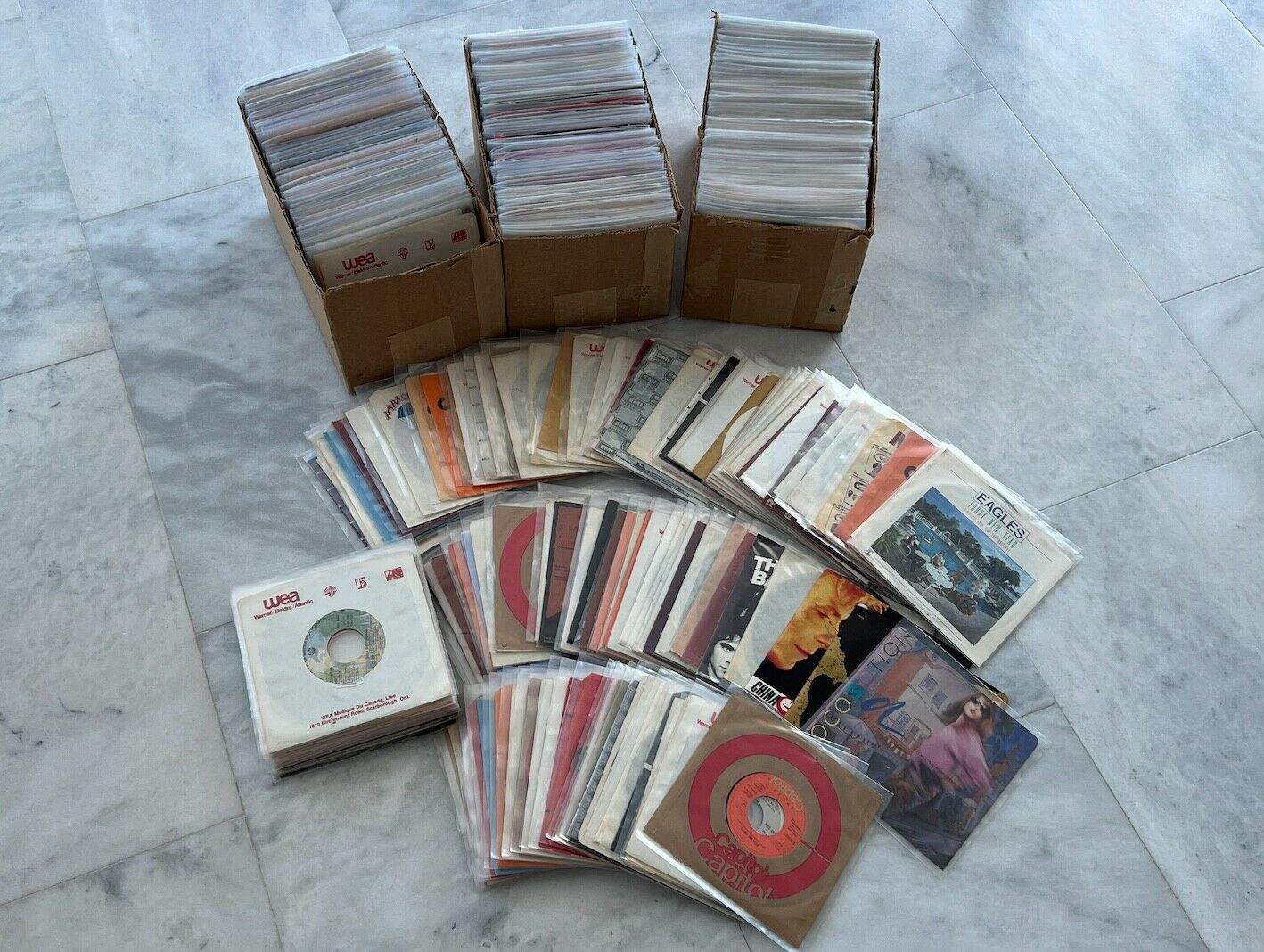Entire collection of vinyl 45s from the 1970s and early 1980s; includes (567) 7" records. Includes mostly Pop, Rock, and Disco. Very well cared for. All in original paper sleeves, with plastic covers since new. Pressings are mostly Canada with some US. Collection weighs approximately 60lbs.