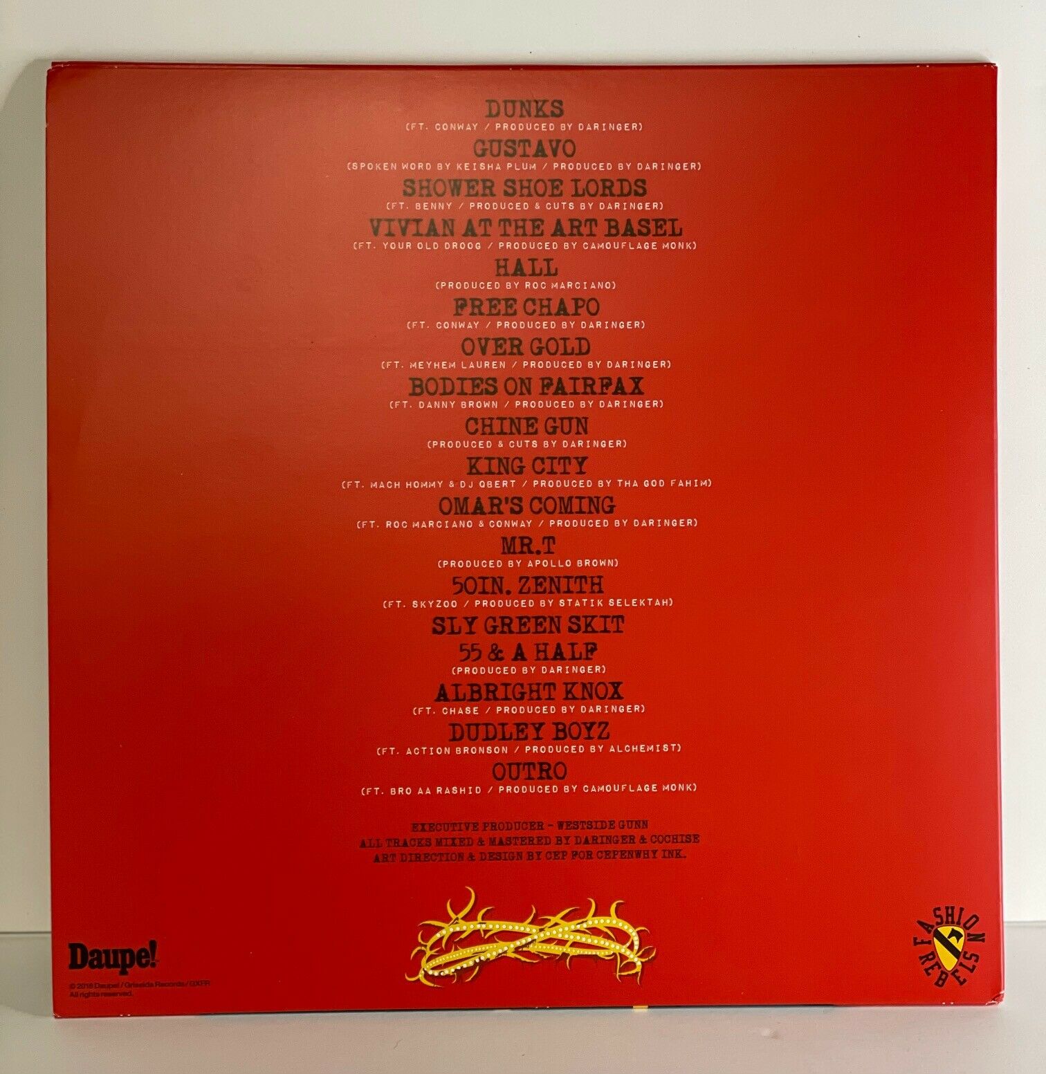 A1 Dunks Featuring – Conway (6) Producer – Daringer* Featuring – Conway (6) Producer – Daringer* A2 Gustavo Featuring – Keisha Plum* Producer – Daringer* Featuring – Keisha Plum* Producer – Daringer* A3 Shower Shoe Lords Featuring – Benny (45) Producer, Scratches [Cuts] – Daringer* Featuring – Benny (45) Producer, Scratches [Cuts] – Daringer* A4 Vivian At The Art Basel Featuring – Your Old Droog Producer – Camoflauge Monk Featuring – Your Old Droog Producer – Camoflauge Monk B1 Hall Producer – Roc Marciano Producer – Roc Marciano B2 Free Chapo Featuring – Conway (6) Producer – Daringer* Featuring – Conway (6) Producer – Daringer* B3 Over Gold Featuring – Meyhem Lauren* Producer – Daringer* Featuring – Meyhem Lauren* Producer – Daringer* B4 Bodies On Fairfax Featuring – Danny Brown (2) Producer – Daringer* Featuring – Danny Brown (2) Producer – Daringer* B5 Chine Gun Producer, Scratches [Cuts] – Daringer* Producer, Scratches [Cuts] – Daringer* C1 King City Featuring – DJ Qbert*, Mach Hommy Producer – Tha God Fahim* Featuring – DJ Qbert*, Mach Hommy Producer – Tha God Fahim* C2 Omar's Coming Featuring – Conway (6), Roc Marciano Producer – Daringer* Featuring – Conway (6), Roc Marciano Producer – Daringer* C3 Mr.T Producer – Apollo Brown Producer – Apollo Brown C4 50in. Zenith Featuring – Skyzoo Producer – Statik Selektah Featuring – Skyzoo Producer – Statik Selektah C5 Sly Green Skit D1 55 & A Half Producer – Daringer* Producer – Daringer* D2 Albright Knox Featuring – Chase* Producer – Daringer* Featuring – Chase* Producer – Daringer* D3 Dudley Boyz Featuring – Action Bronson Producer – Alchemist Featuring – Action Bronson Producer – Alchemist D4 Outro Featuring – Bro AA Rashid* Producer – Camoflauge Monk
