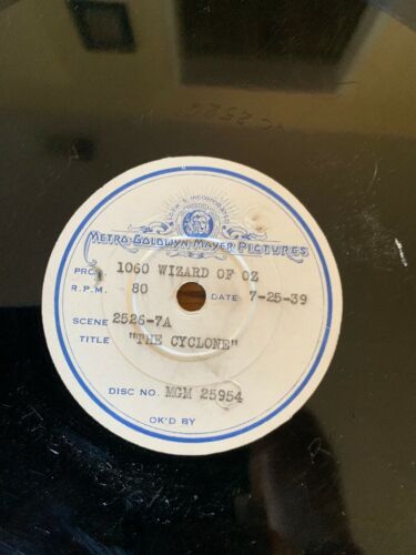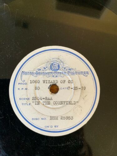 Own a piece of Wizard of Oz history!! This is a one of a kind test pressing on 78 rpm of 'In the Cornfield' and Cyclone' from the musical score of the film. These do appear on later vinyl and CD releases....but never on a 78. Also, it lists the rpm as 80, which is interesting as well. It has been pressed on vinyl, not shellac. It is scratched unfortunately...it does play with ticks...it does not skip. It is darn cool to behold with the MGM white label. I hate to 'surrender' it.